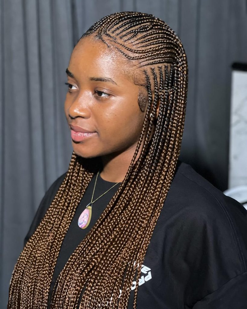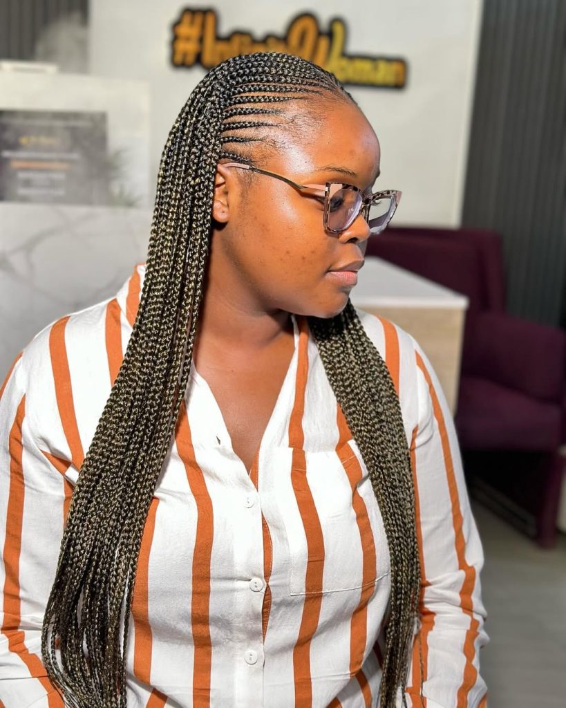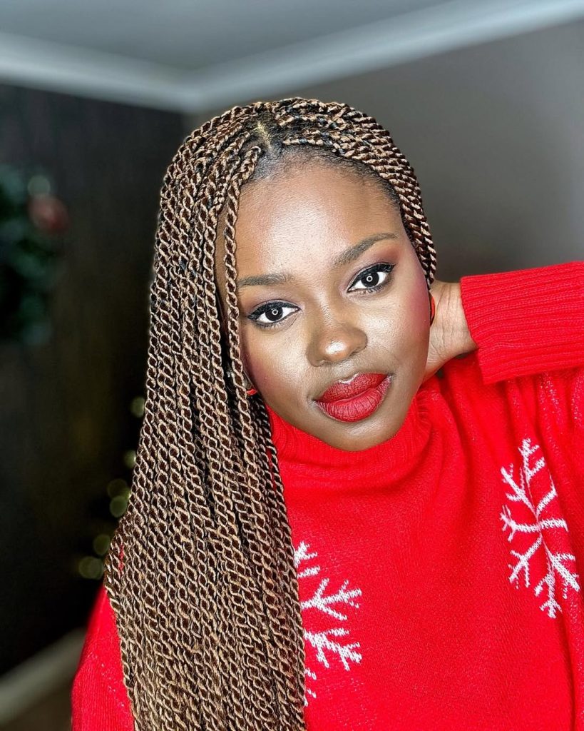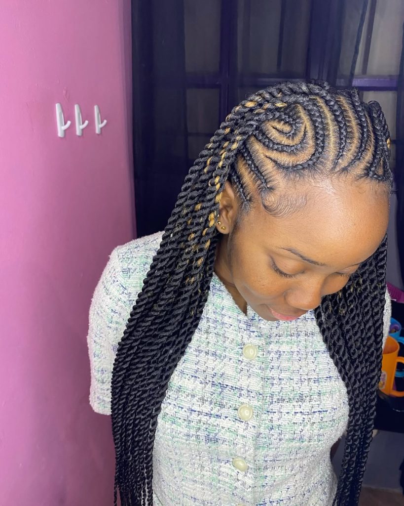 These take the shape of neat cornrows and then a twist into long braids with small golden highlights in-between. The highlighter is very warm and shiners and this style works well with dark skin. The hairstyle is a bold and visible eye wear and a mixture of tradition and a twist of modernity.