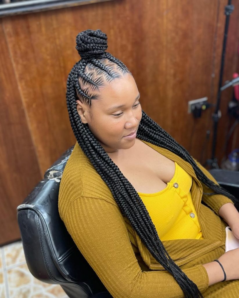 These are cheeky and classy box braids in two high buns which add an instant freshness. The appearance has a light-hearted and carefree feel and maintains the braids in a well-kept updo. It is that type of inspo that will have you feeling adventurous, particularly during colder seasons, when a burst of energy will feel reinvigorating.