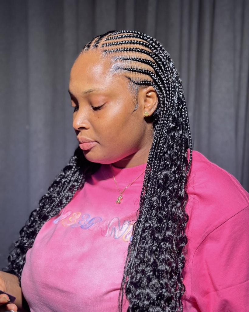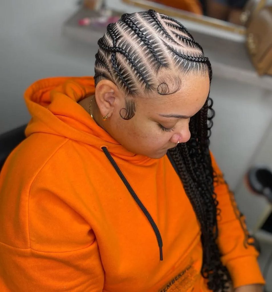 The melted cornrows at the ends to soft curls makes the style of hair feminine and full of motion. The lines are straight at the top making it structured, the waves further make it soft which is flattering the face. It is a combination of tradition and modern style which makes the style an easy favorite in winter 2025.