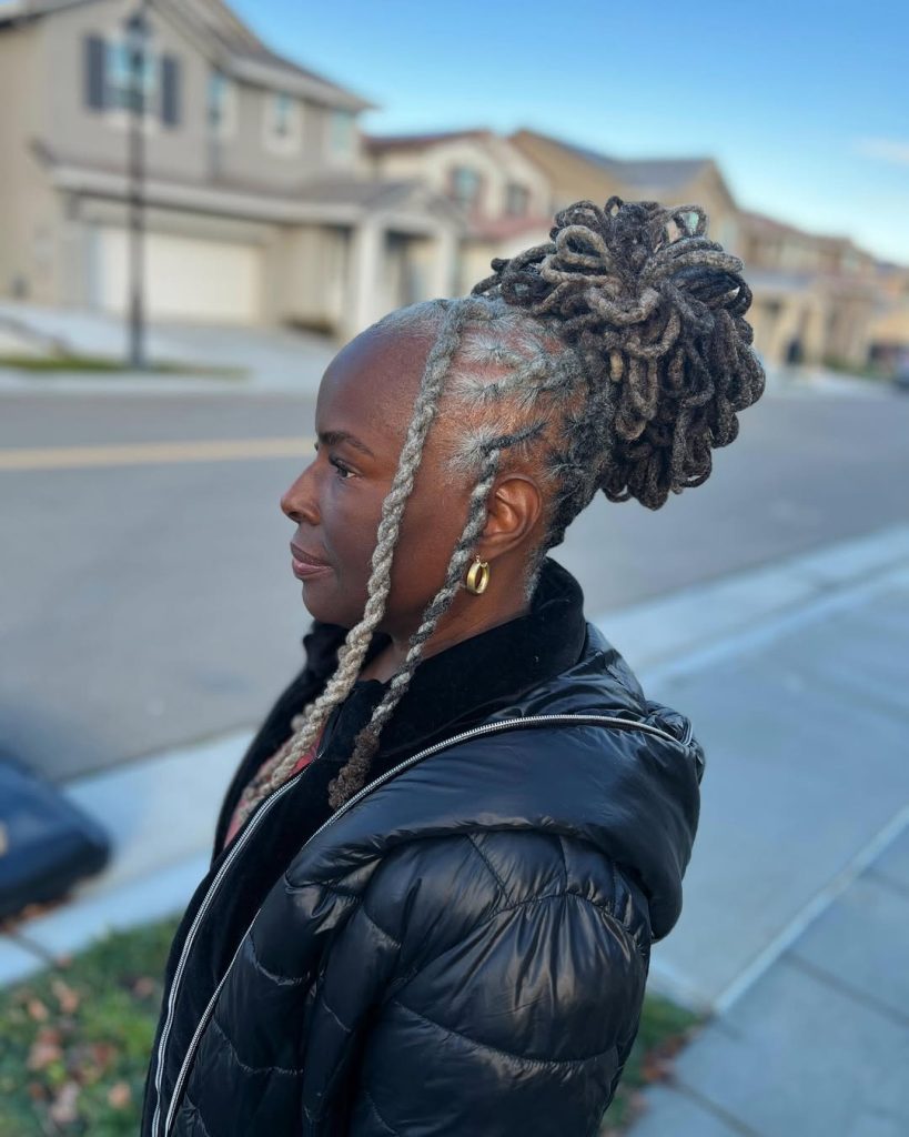 There is a certain strength in wearing silver strands and this top-tier of gray locs demonstrates how beautiful they can be. It is royal, daring and loaded with personality- a hairstyle that is wise and fashionable at the same time. It is ideal during winter since it is snug and authoritative.