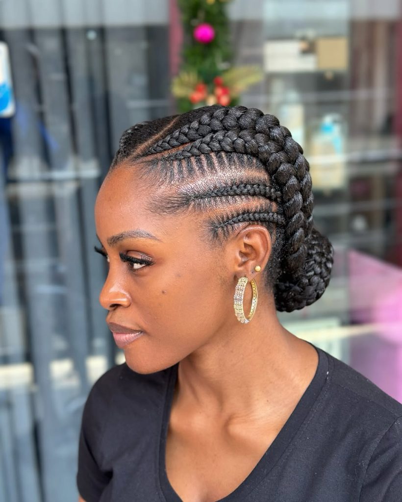Slick cornrows which are twisted in a low bun elicit an elegant and age old look. It is graceful, convenient, and fits well with female customers who prefer elegant, but not too complicated attire. The fashion has a hint of elegance, suitable both at the workplace and in a business context.