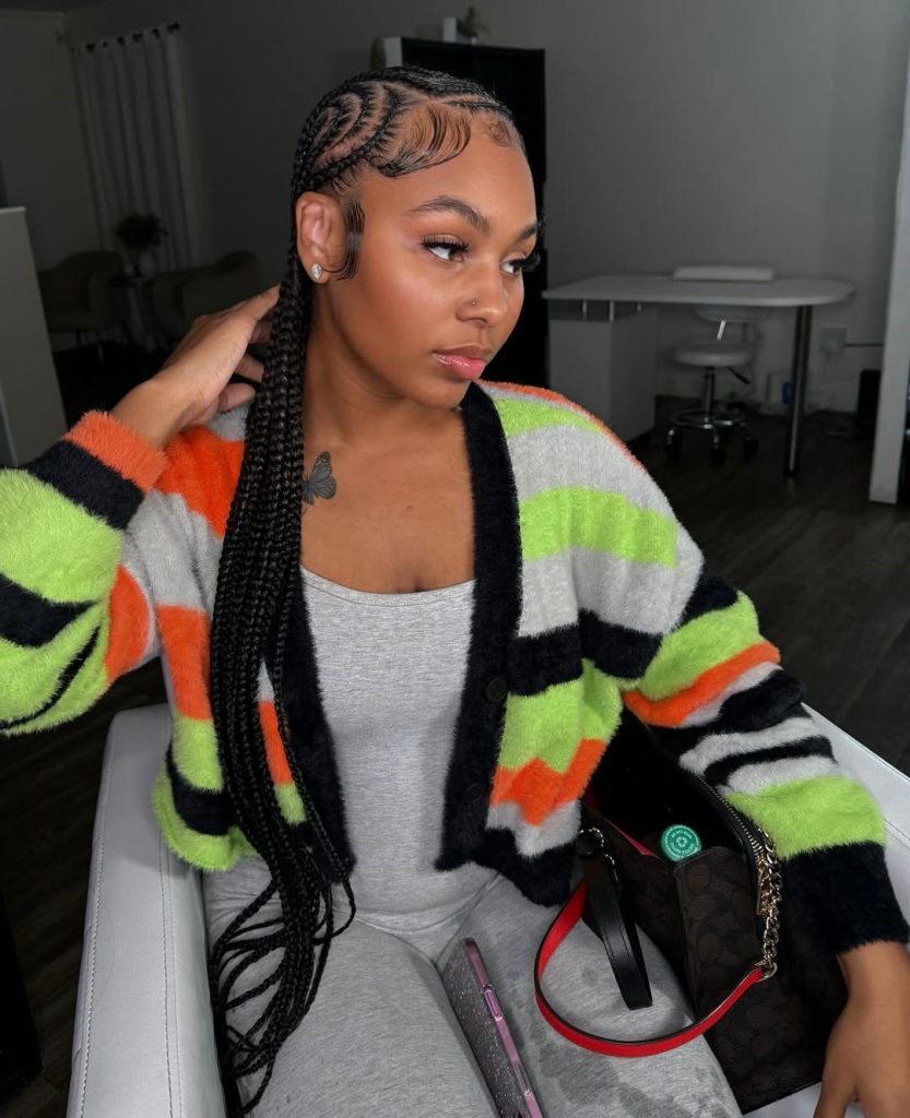 Something formidable about a hairstyle that seems appear stylish and at the same time, appeared natural, is powerful. These perfectly styled edges make these cornrows braids look professional and fresh in winter 2025. The long length and the clean lines exude a feeling of confidence and style but the detail around the hairline provides that additional touch of personality. It is the kind of look that is both structured and soft at the same time – the ideal inspo when you want your hair to be noticed but not overly loud.