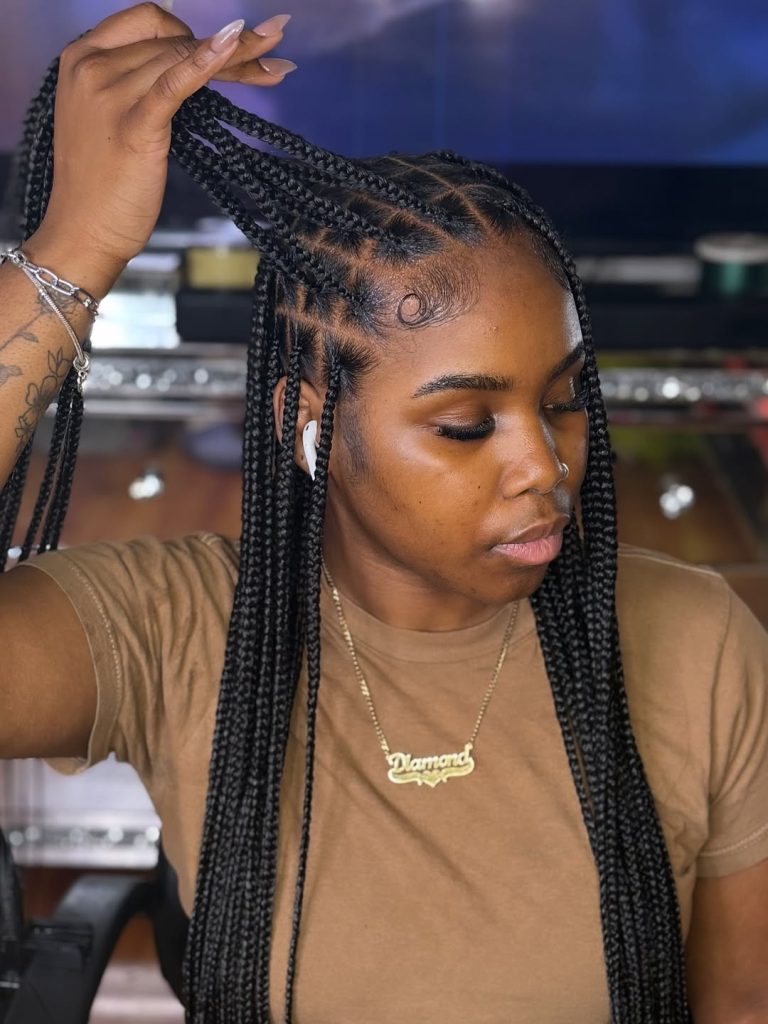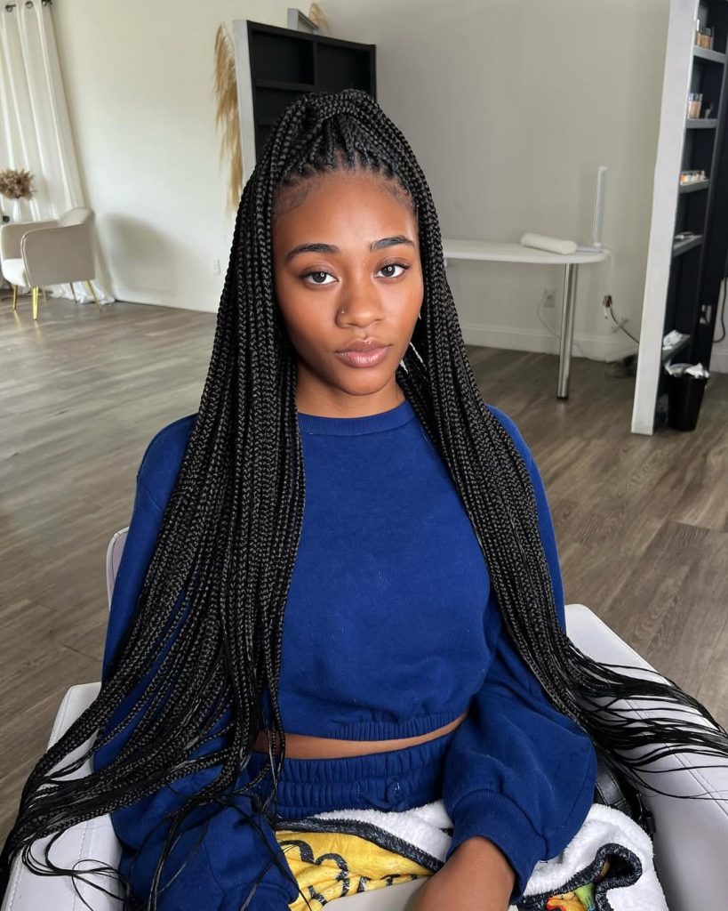 Something will always be old fashioned with the long box braids as a sleek high pony tail. This is a practical but eye catching style that provides you with height and movement simultaneously. It is fresh and confident with a vibe that fits best in winter 2025 when you need to keep your hair tucked but still cool. It is flattering to all face shapes because of the playful lift that the ponytail gives.