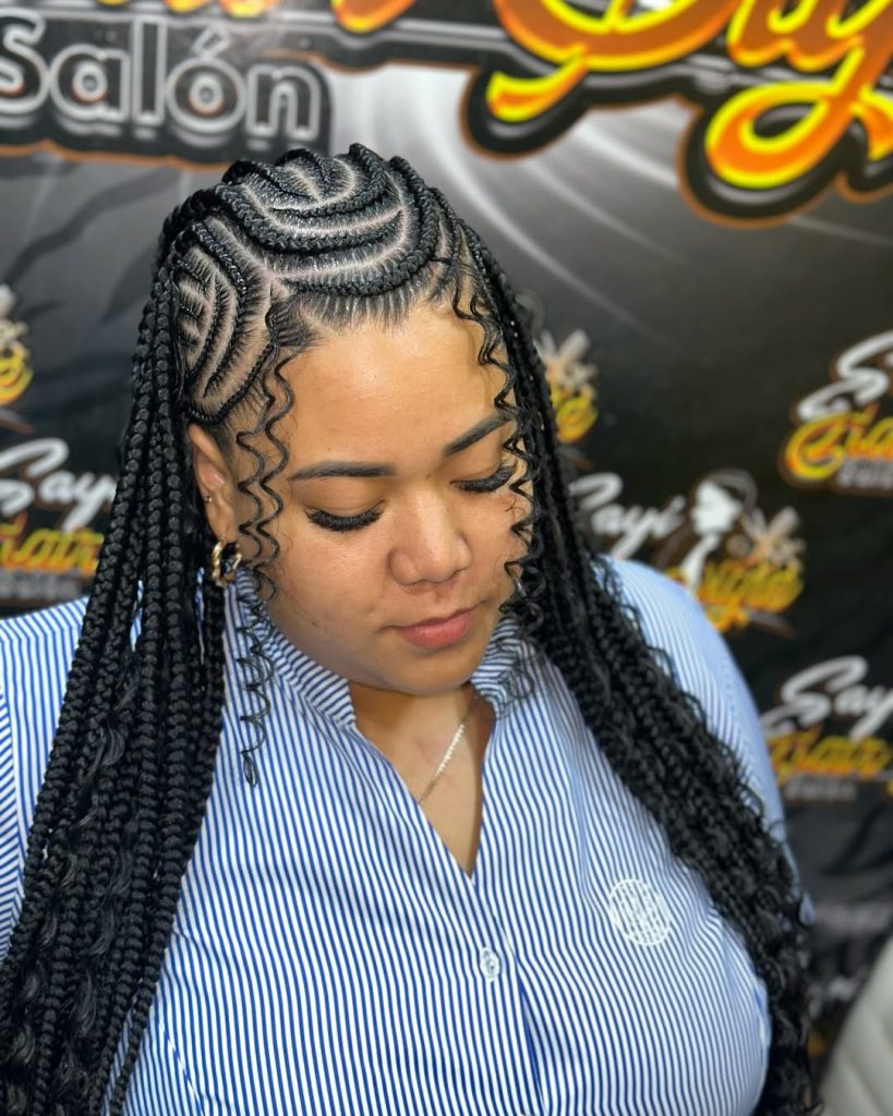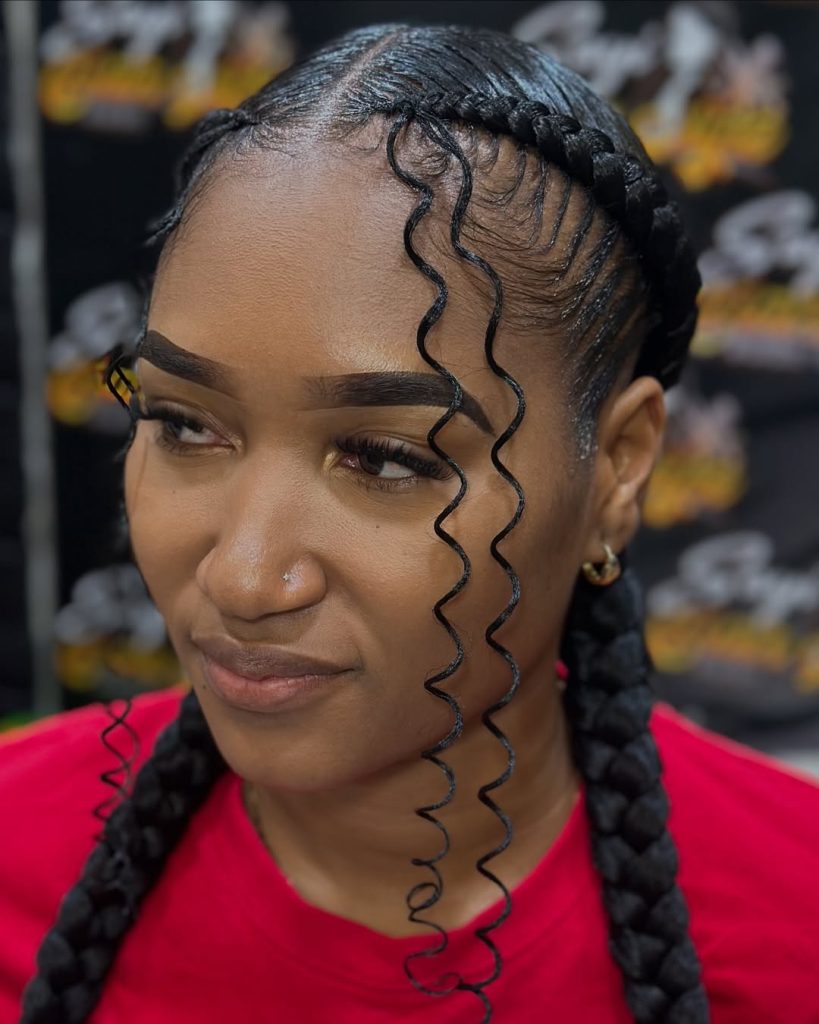This hairstyle is an art work – elaborate swirl cornrows and light spiral curls framing the face. It is daring and feminine, a statement style that demonstrates accuracy as well as boldness. It is ideal in winter 2025 and one of those hair styles that make the wearer feel immediately well-dressed yet with a playful tone.