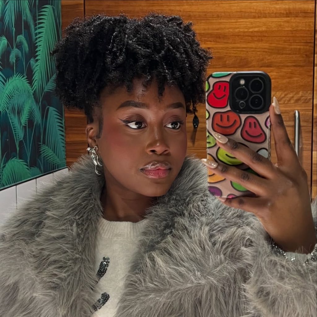 Lighthearted and easygoing, afro puffs paired with loose locs make a characterful hairstyle and a joyful one. It is a young, playful style that is invigorating in winter – light-hearted and yet protective. The volume also contributes to energy and the loose front locs also frame the face well which makes the style balanced.