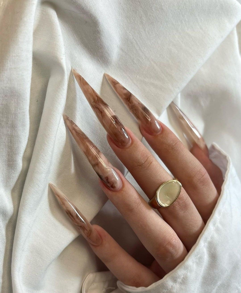 As far as I am concerned, the primary attraction of these nail styles is the artistic part of them. The long acrylics are beautifully designed as they look like swirled brown shades and are mixed with delicate stars. The two elements can be imagined as the bright twinkle of a clear night sky and the warm color of caramel,; hence, the two elements are earthiness of caramel tones. They are heavenly in appearance and be worn by those who aspire to have a small piece of the universe at their fingers.