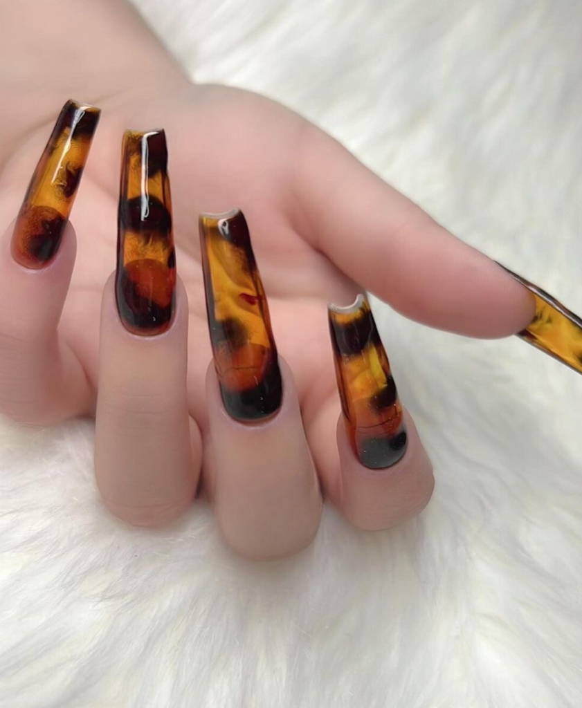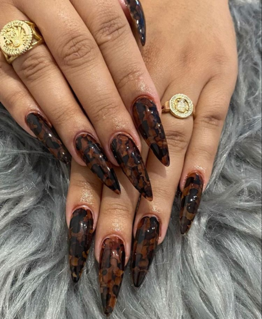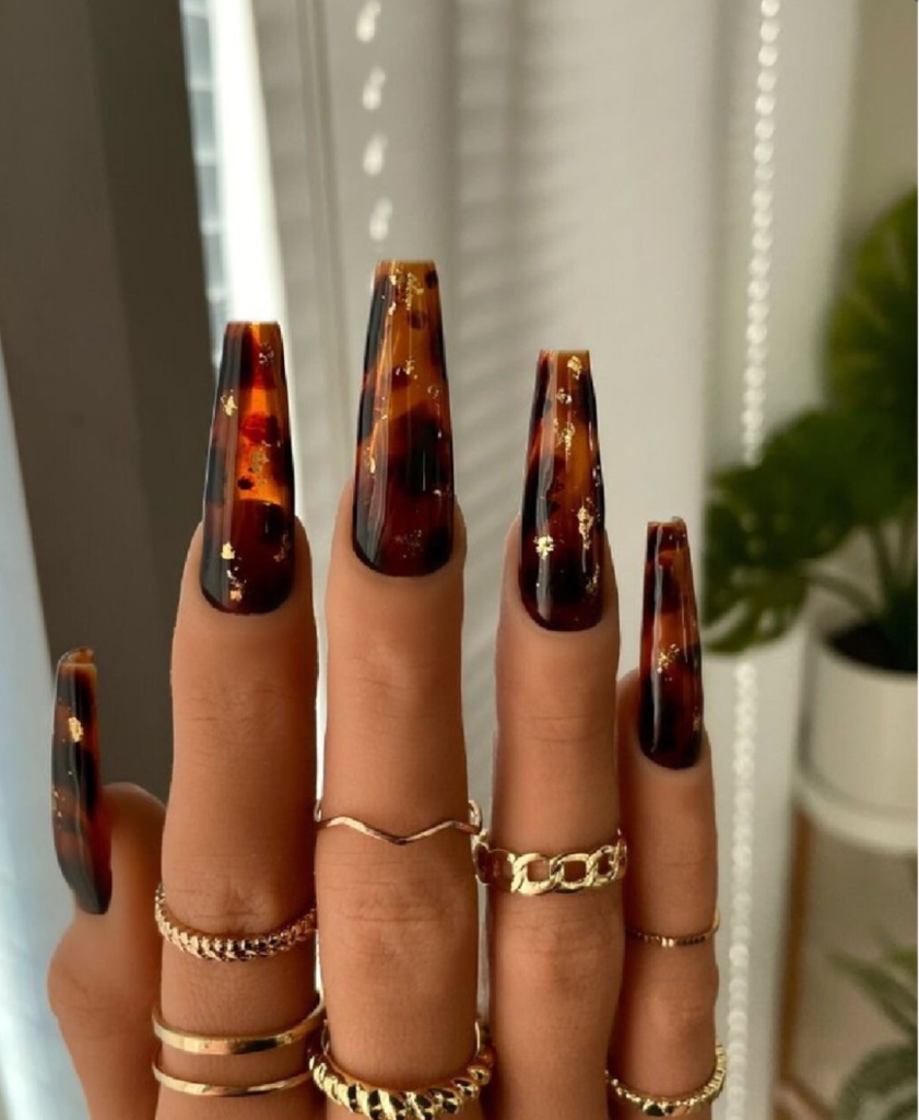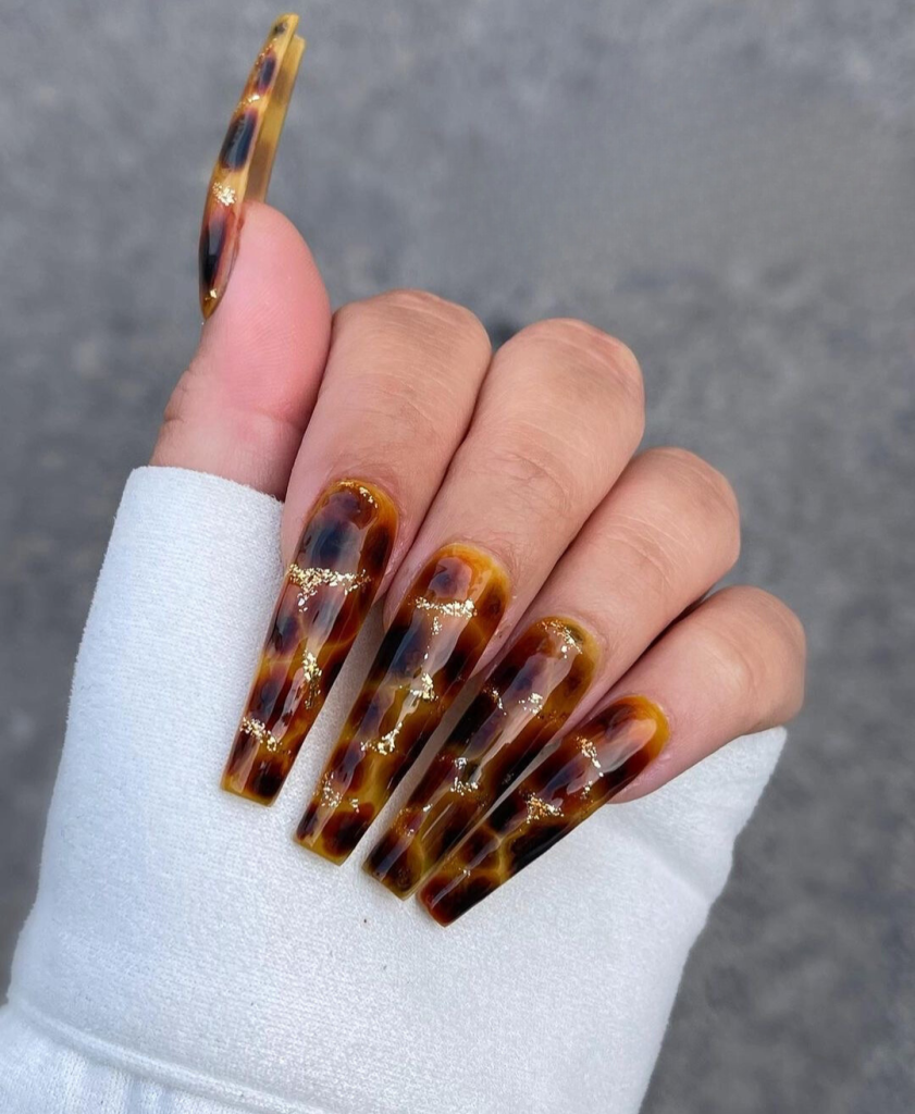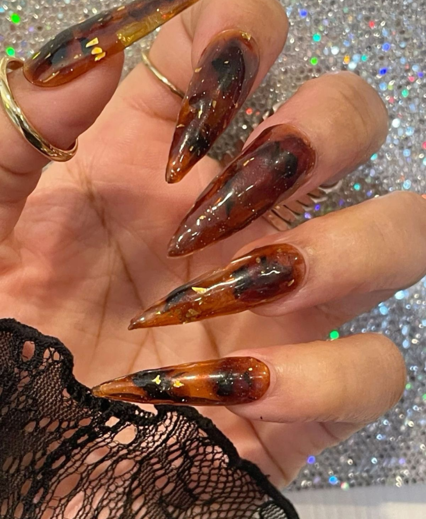 This long and dark acrylics are the eyes catcher in the nail fashion with the classic tortoiseshell pattern. This multicolor style is made up of shades of brown and black that give a cute and classy look. Accents like gold flakes can be added for that extra sparkle, making these nails a conversation starter at any gathering.