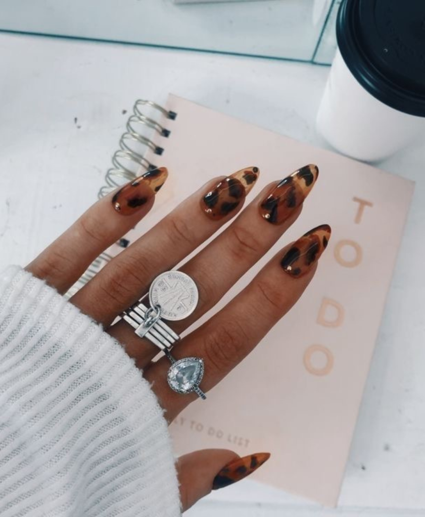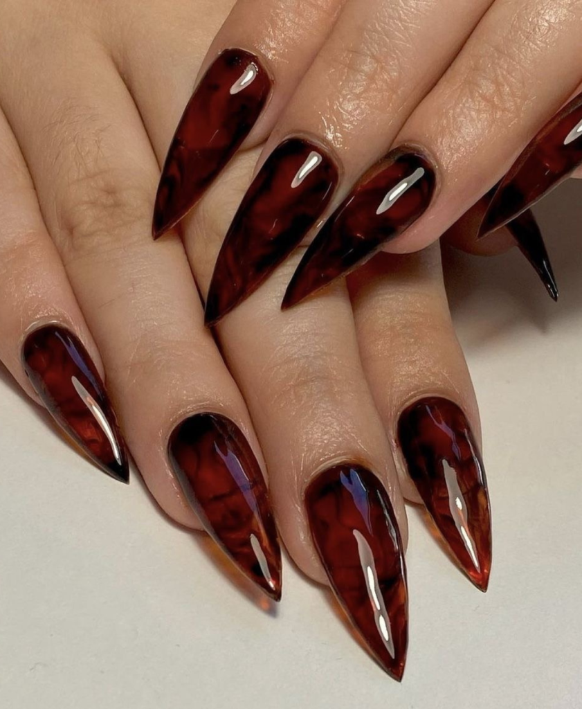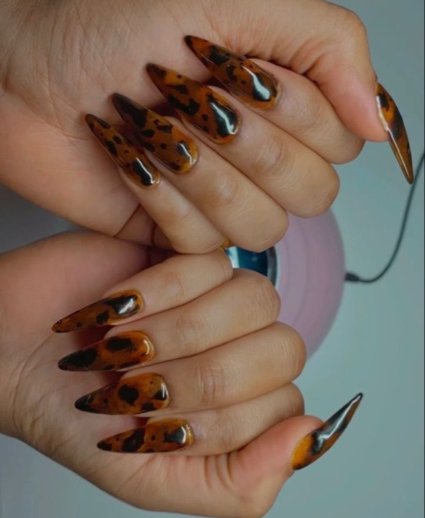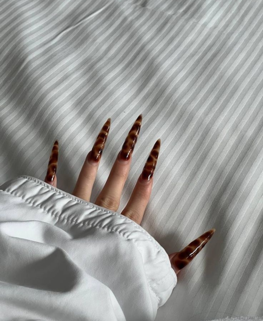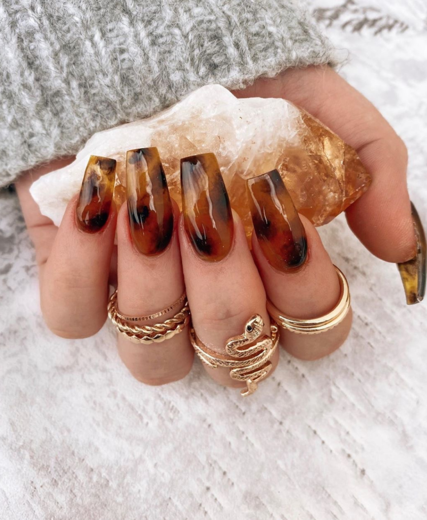This long and dark acrylics are the eyes catcher in the nail fashion with the classic tortoiseshell pattern. This multicolor style is made up of shades of brown and black that give a cute and classy look. Accents like gold flakes can be added for that extra sparkle, making these nails a conversation starter at any gathering.