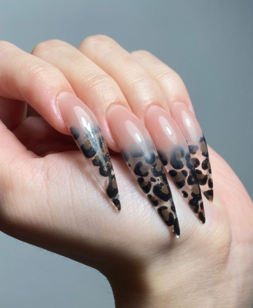 These nails belong to a high-school revival with a long gang design of classic leopard print. The leopard spots showcased on clear nails are carefully arranged to come up with a fierce but cute appealing design. The design is aptly called after the animal print trend that has yet to tarnish in the fashion industry.