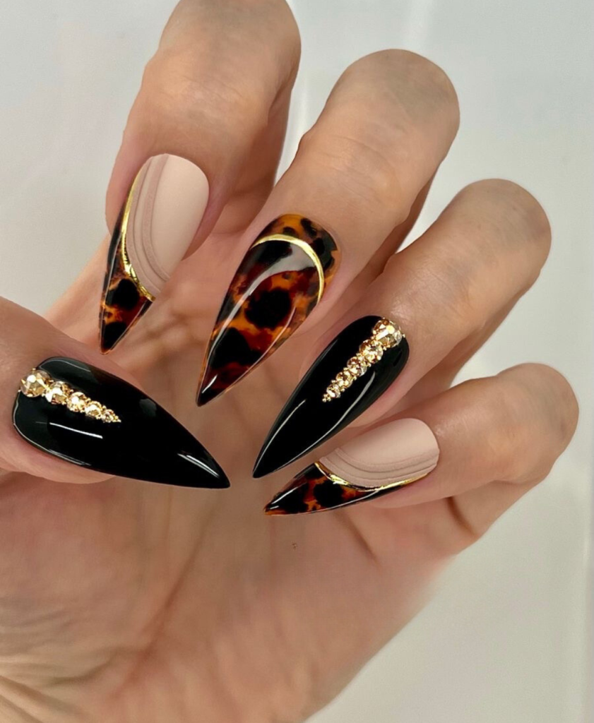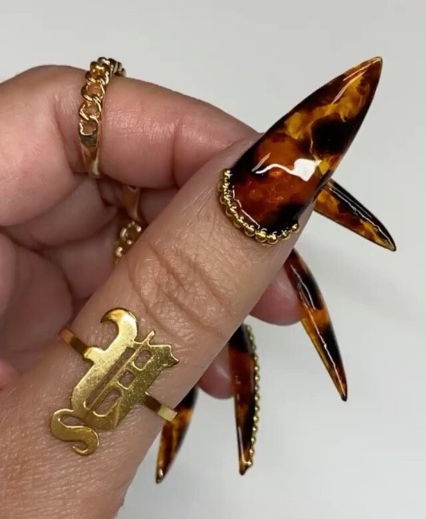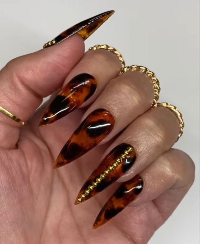 Nails with a pattern that looks like royalty and eternal fashion is a salute to personal style that’s both daring and design-long. These long, stiletto-shaped nails, which are made with tortoiseshell patterning and golden chain accents, are the best way to explain what design nails with the most impact look like. The high gloss finish and glitter from the golden elements make it even more luxurious to this already cute and natural look.