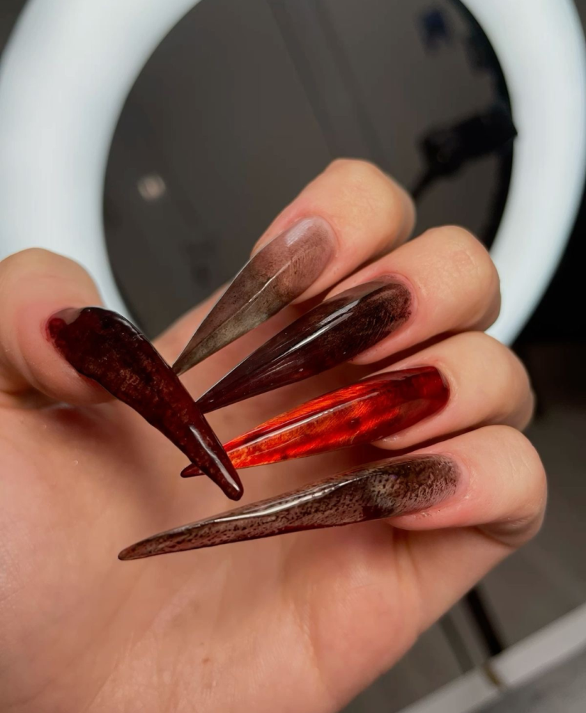 An eye-catching deep mahogany to crimson gradient with an ombré effect is found right here. The long nails serve as a palette for this warm, multicolor display that symbolizes the dazzling beauty of autumn. The high gloss finish makes sure that every single shade of brown and red will catch the light, thus making these nails shine in the daily life of the wearer.
