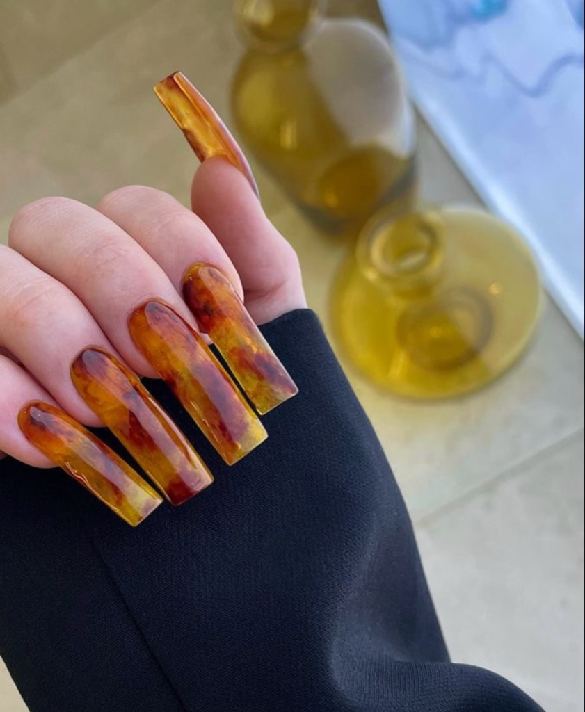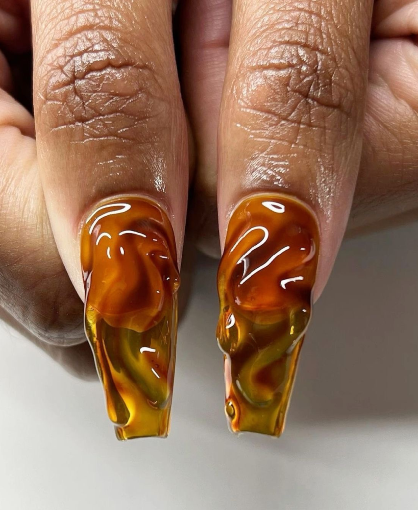 This is a very good way to describe the long nails that is an abstraction and they are designed to look like the flowing caramel. Their wet, reflective surface almost reflects the light like the sparkle, while the multicolor swirls construct the vision of a sweet confectionery. This style is for those who love the mix of earthy shades with the edge of art.