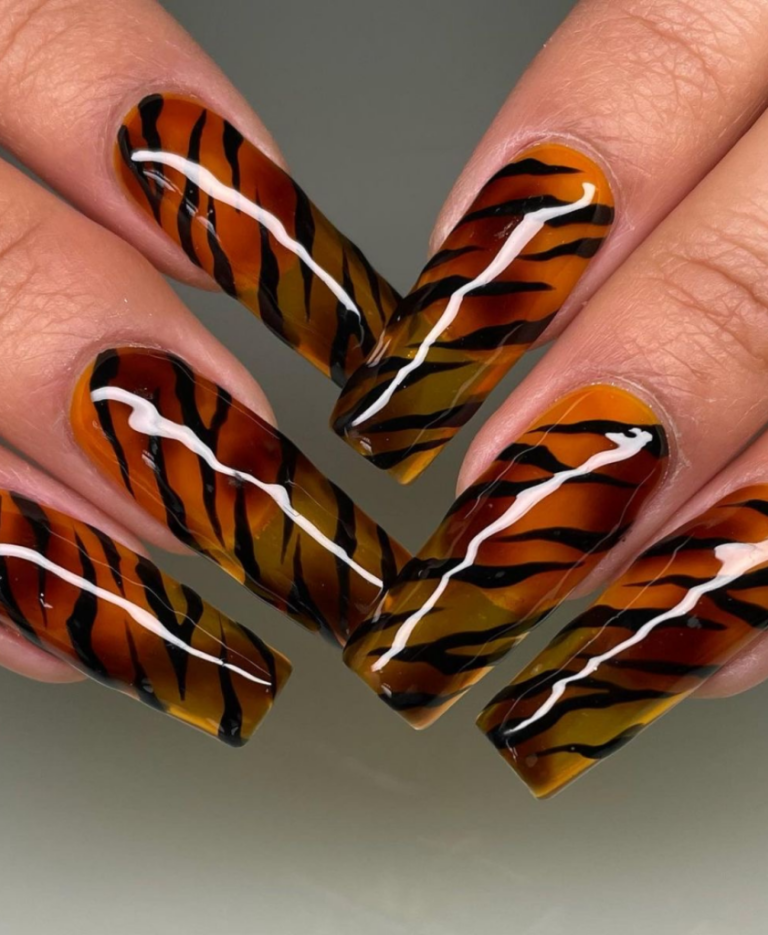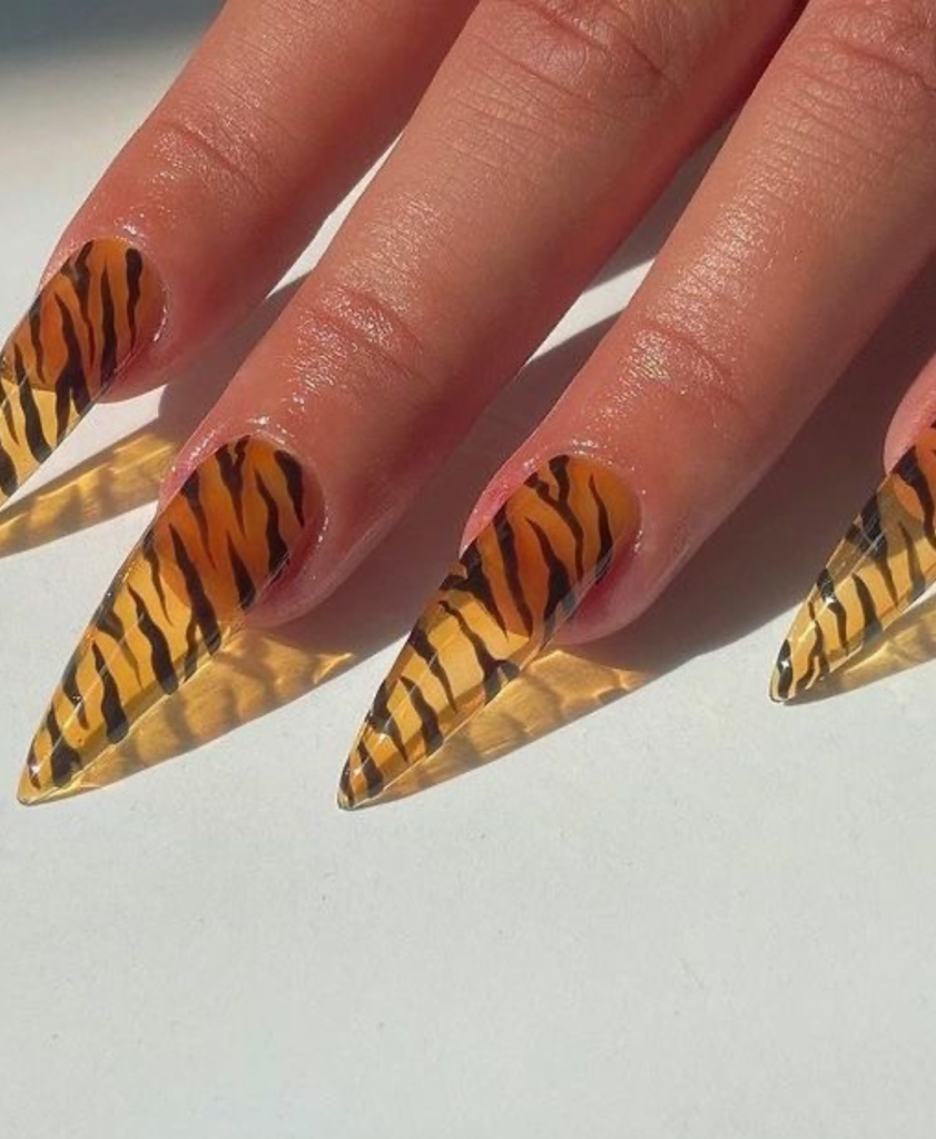 These claws capture the spirit of a tiger, the predator and the animal in the wild; they are made with the form of pointed tips that look like a design short while they still are long. The brown and black tiger stripes on a clear base are very bright and cute, a design that is certainly going to be the talk of the room and a good point for conversation.