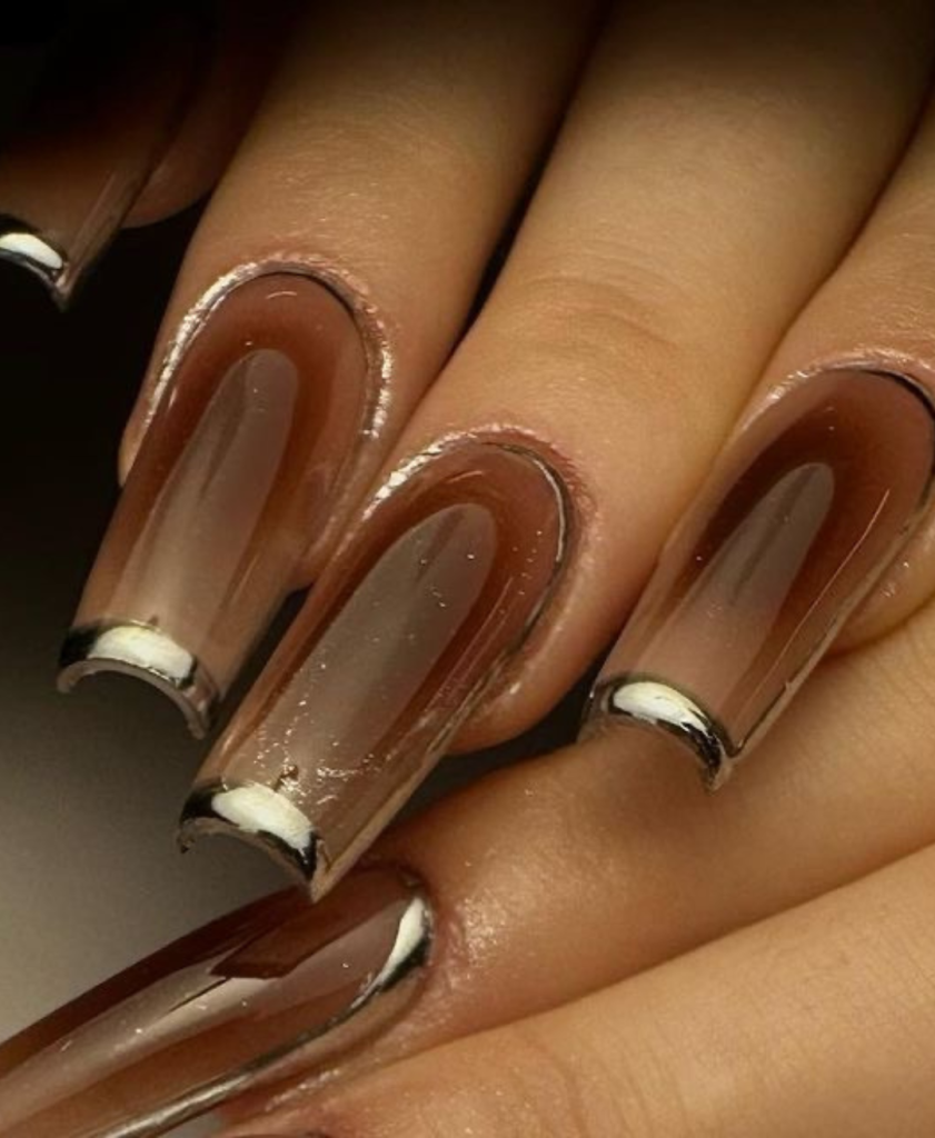 Having been inspired by the coffin nail style, these brown acrylics argue back in a minimalist style. The original shade of brown is enhanced by the prominent silver outline that is used to separate the design from the long, glossy nails. It’s a mostly but not completely cute design that combines simple features with a bit of modern nail decoration.