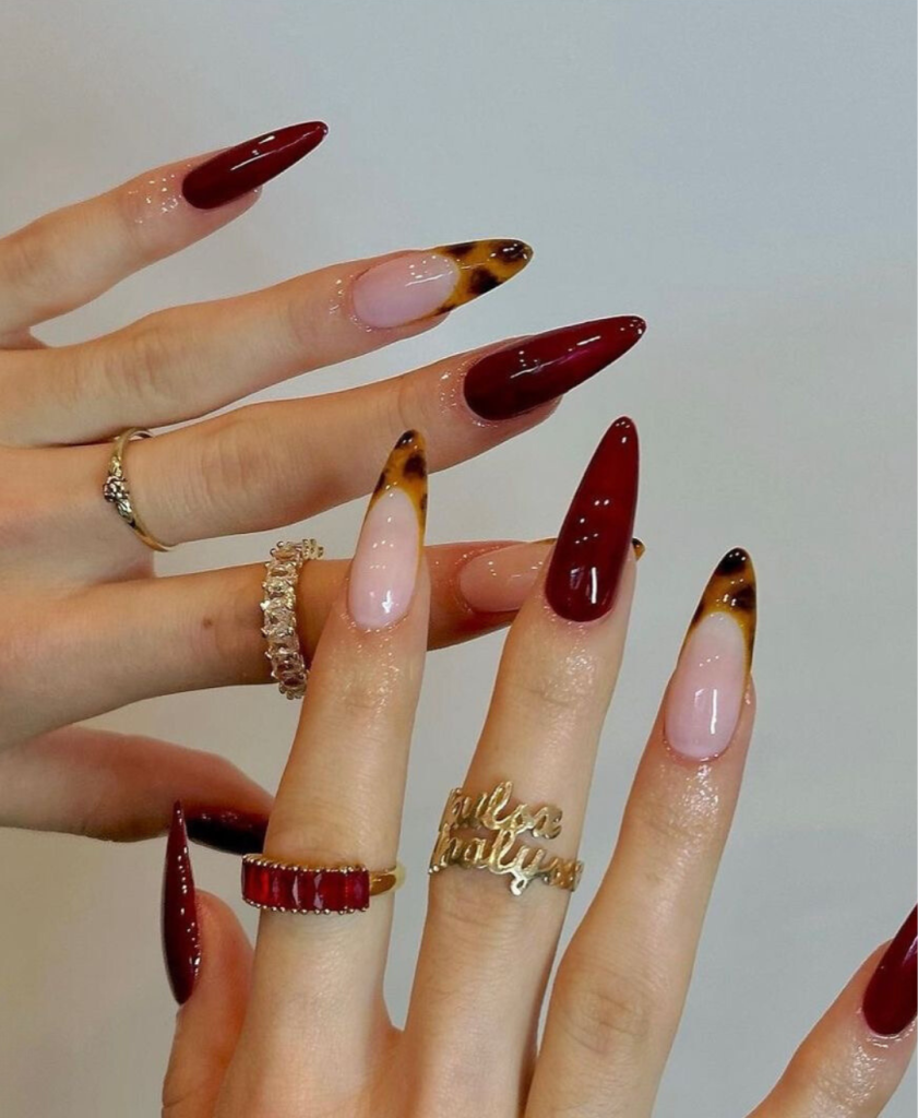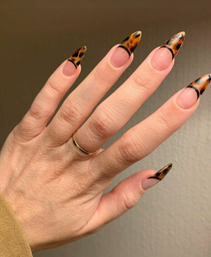 These nails are a twist on the beloved French tip style. The innovative combination of a classic tortoiseshell design at the tip and a modern look makes it even more stylish. Their short length is appropriate for daily wear and is very practical but at the same time, it shows a fashion sense and a certain trend.