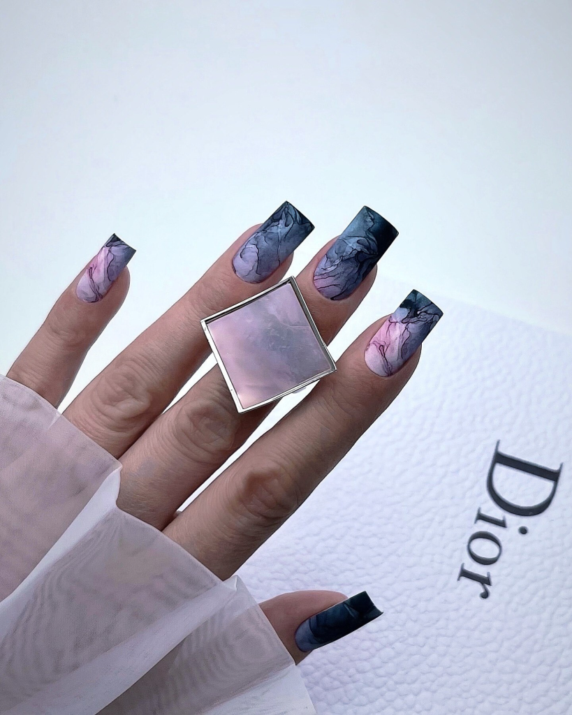 For those who love a classic and timeless look, these black and white marble nails are a must-try. The elegant marbling effect creates a striking contrast, making these nails a standout accessory for any outfit. This design is perfect for any season and can be easily achieved with gel polish. For a more matte finish, consider using a matte topcoat. These nails are especially flattering on coffin or almond shapes, giving them a sleek and stylish edge.