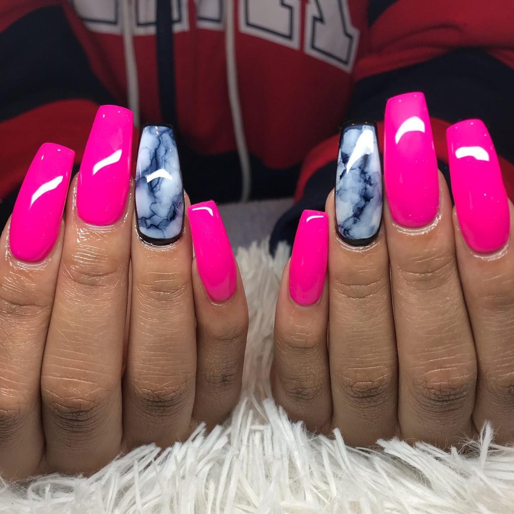 6. Vibrant Pink and Black Marble Nails