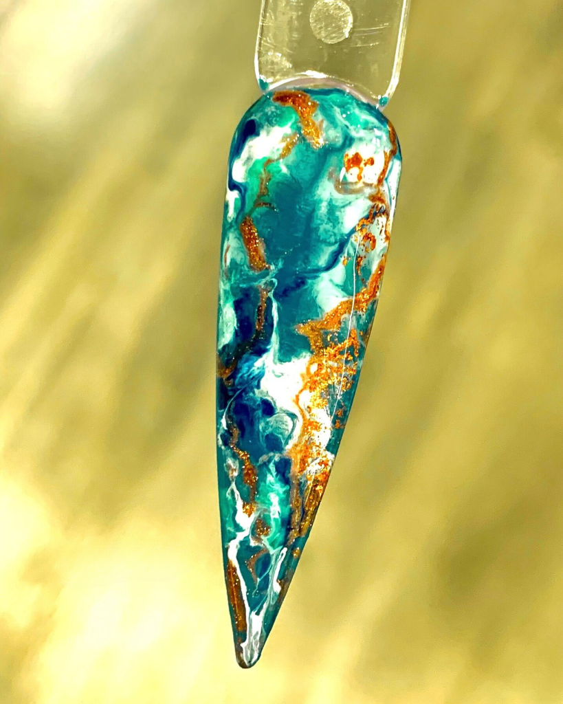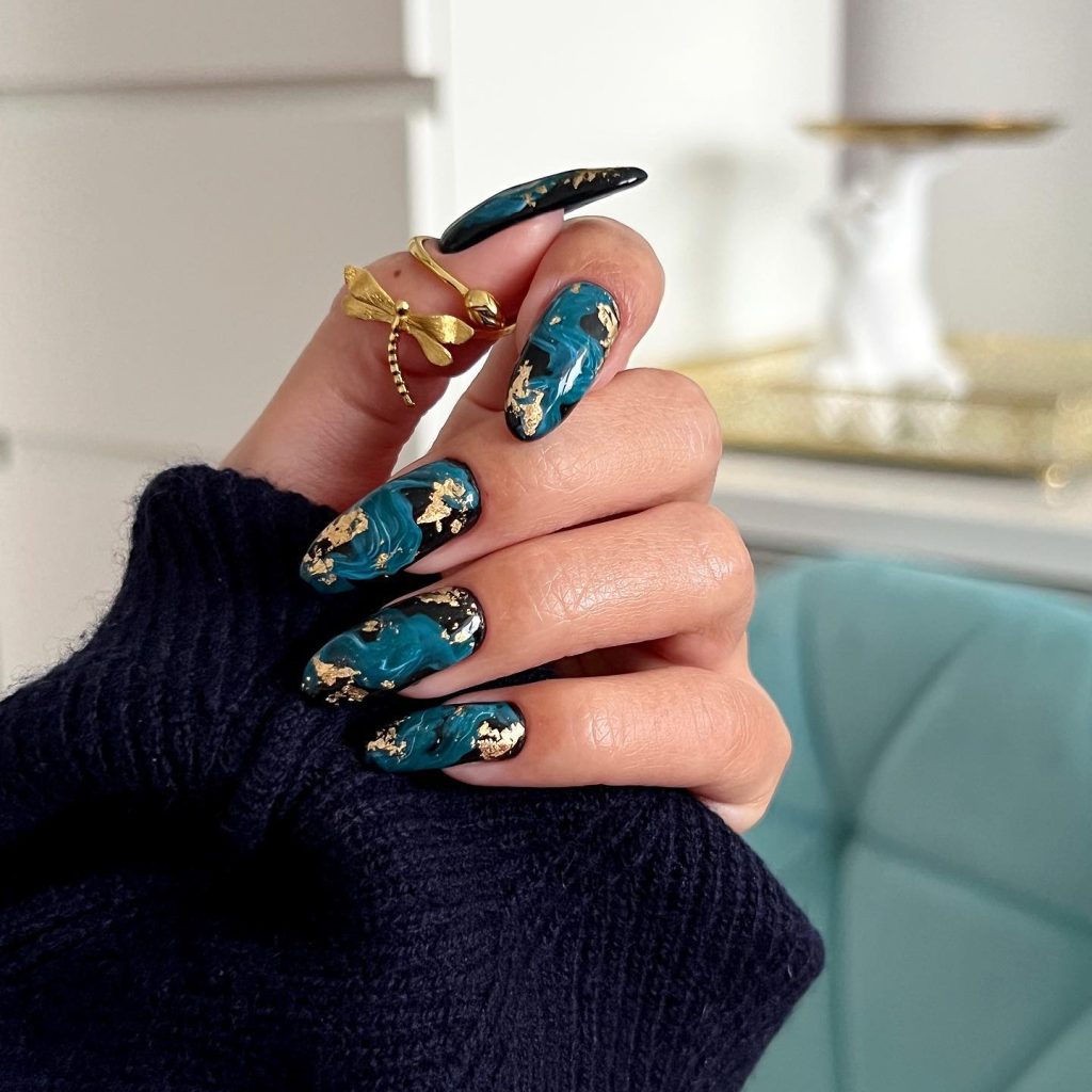 22. Teal and Gold Marble Nails