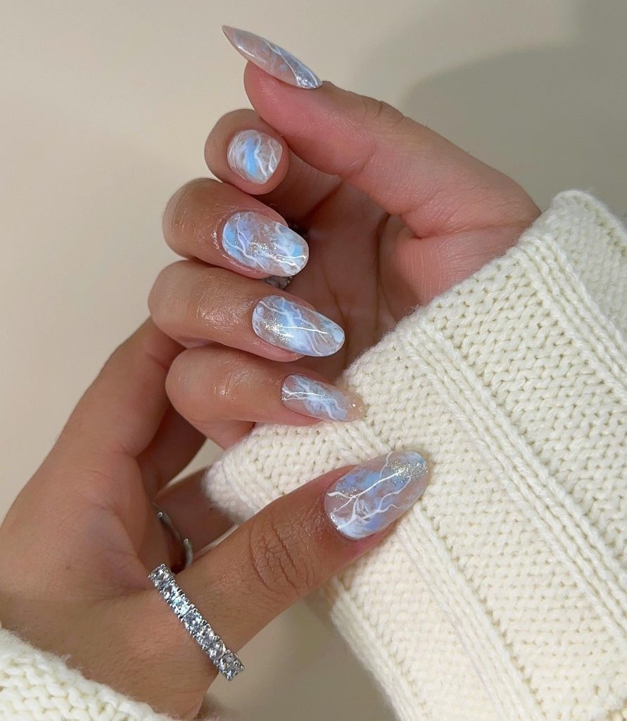 9. Soft White and Blue Marble Nails
