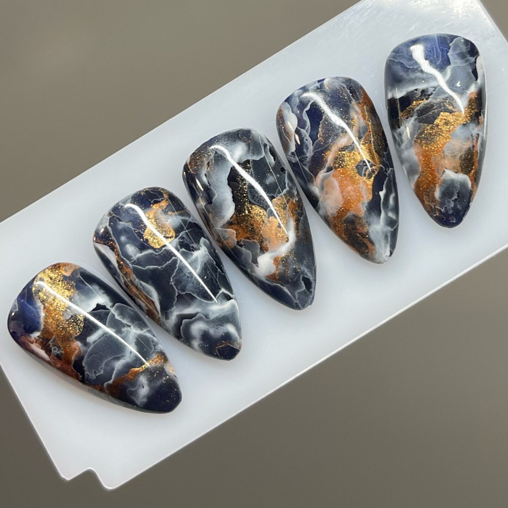 A beautiful deep blue marble design, this set features almond-shaped nails that are both elegant and timeless. The blue tones evoke a sense of calm and sophistication, perfect for cooler months or formal events. The almond shape elongates the fingers, making them look more graceful, while the rich blue marble design adds a hint of mystery. This design is an excellent choice for women who love subtle yet impactful nails that reflect both style and grace.