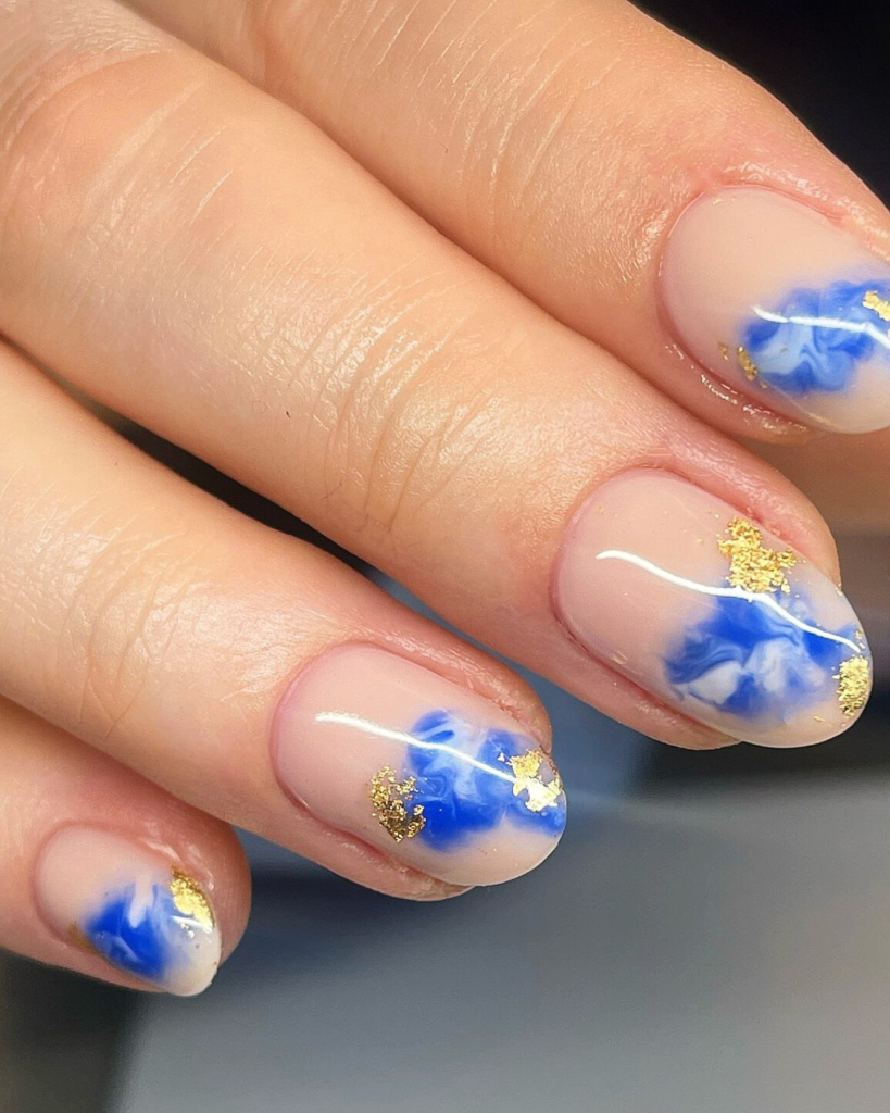 25. Blue Marble Nails with Gold Foil