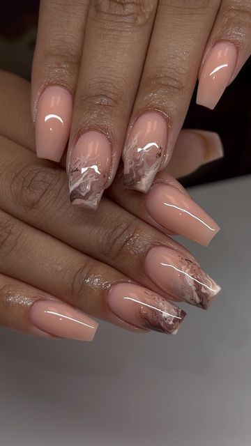 This chic marble design blends warm brown tones with soft nude shades, creating a balanced and natural look. The subtle marble detailing on a few accent nails adds just enough interest without overpowering the neutral palette. Ideal for those who prefer understated elegance, this manicure is perfect for fall and winter, complementing neutral wardrobes and cozy outfits. The glossy finish keeps the nails looking polished and sophisticated, making it a versatile choice for both everyday wear and more formal events.