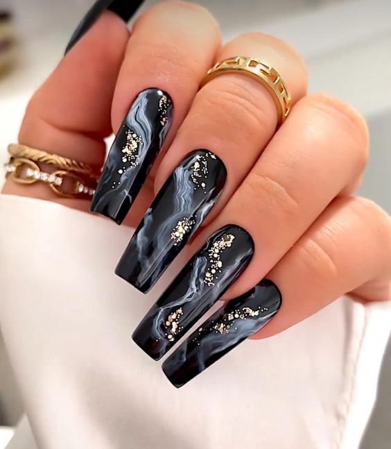 This striking black and white marble design is both bold and sophisticated. The black marble base is enhanced by white streaks, creating a dramatic contrast. To elevate the look, small gold flecks are scattered across the design, adding a touch of glamour. The long coffin shape amplifies the boldness of the manicure, making it perfect for special occasions or when you want to stand out. This design is an excellent choice for those who love strong, daring looks but still want a refined and polished finish.