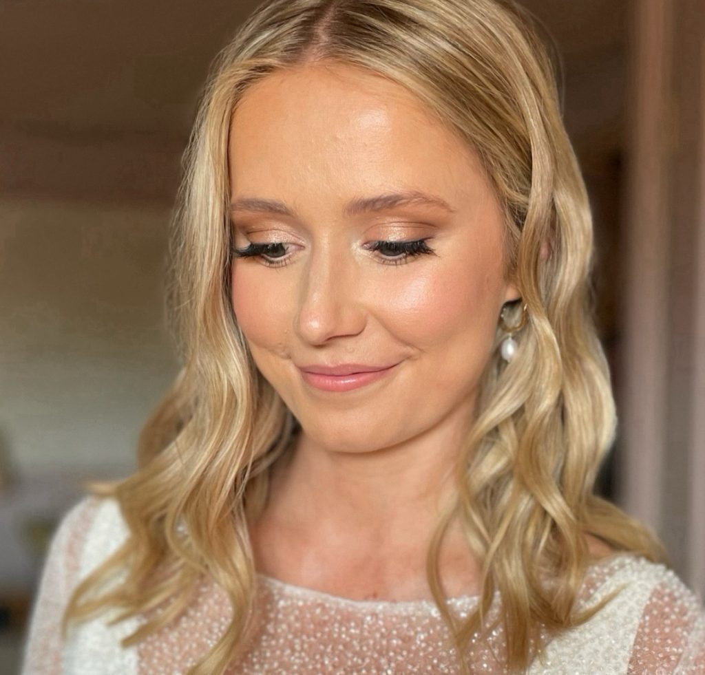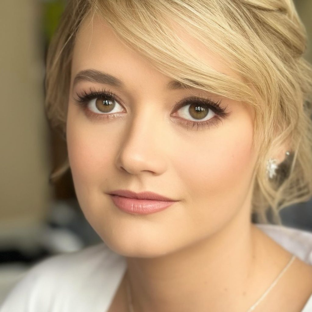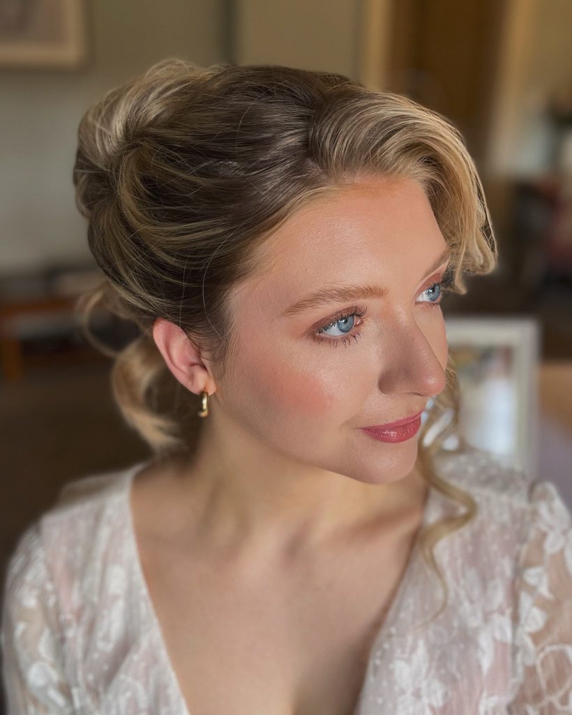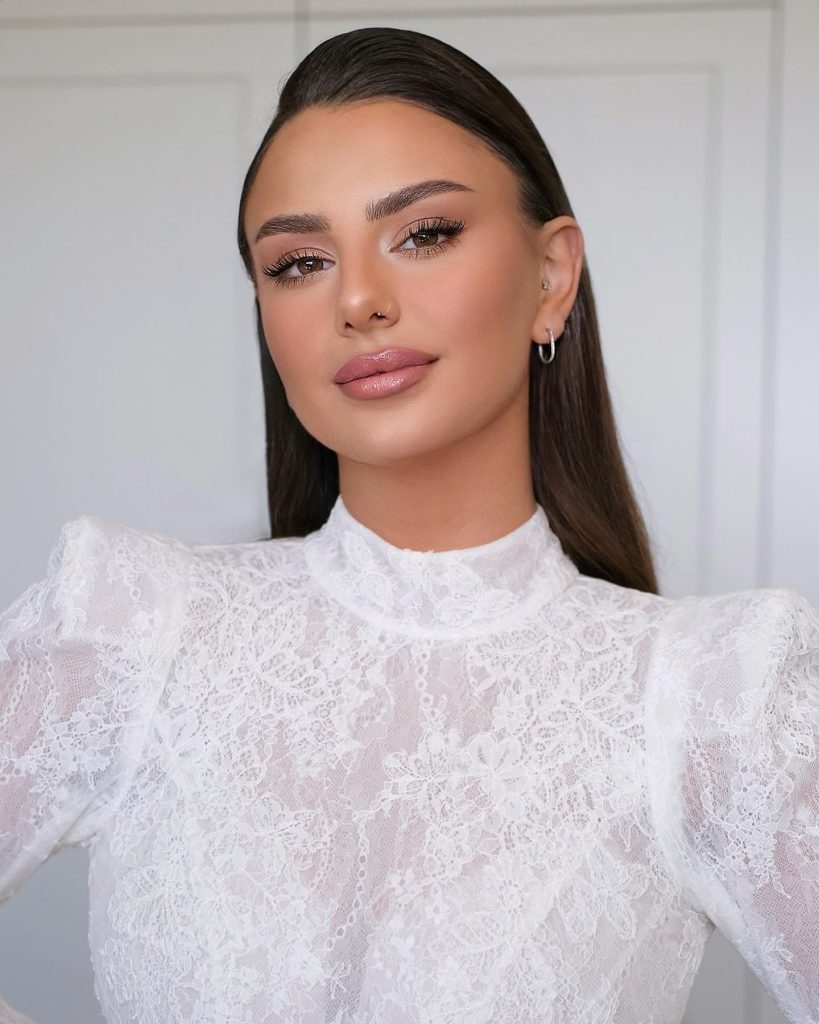 The priority of this look is a soft glow and a natural shine. The bride’s blue eyes are set off by light brown eyeshadows and a trace of mascara, which makes them look more natural. The painter of her lips is a soft pink color, while her cheeks have a natural flush, which is an added attraction to her theme of light. A minimalistic makeup reflects the personality of the bride, who loves being simple and natural.