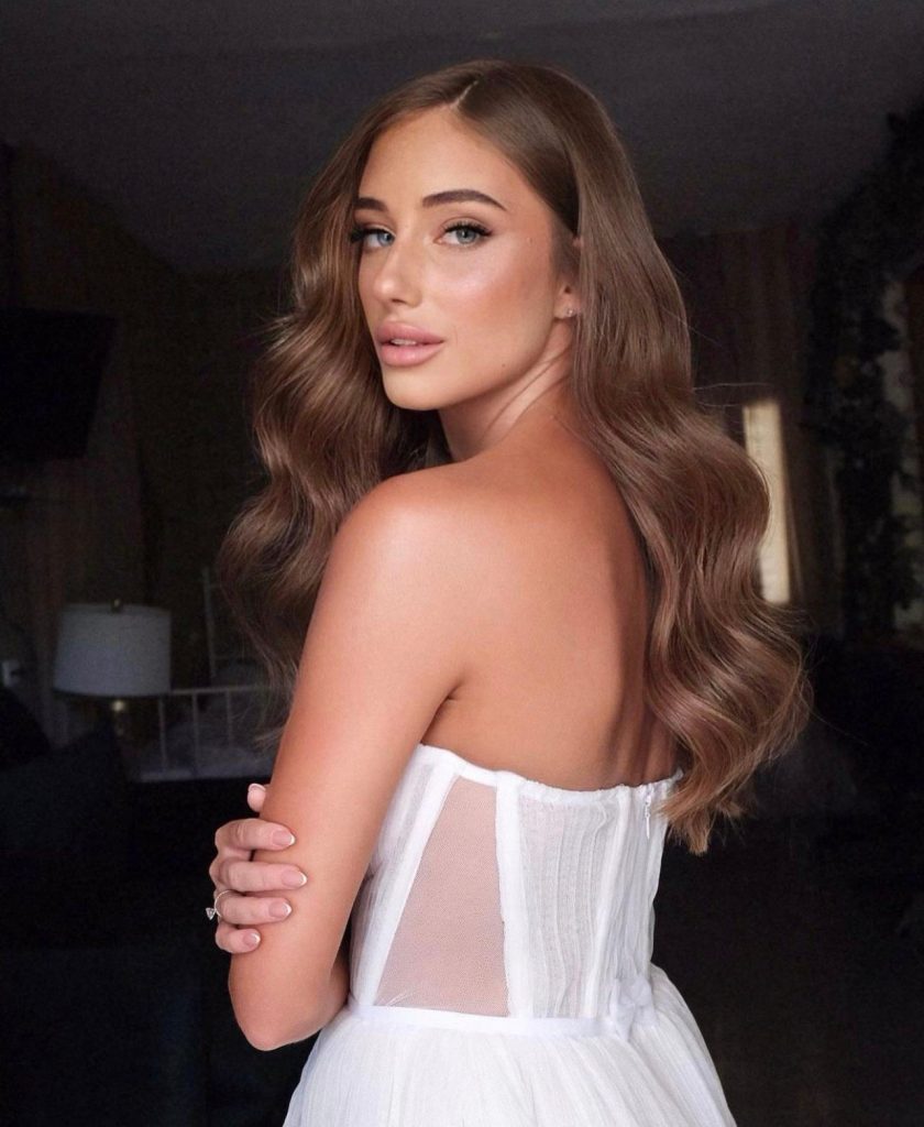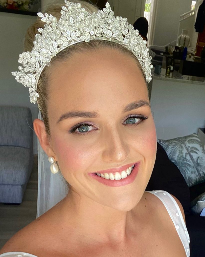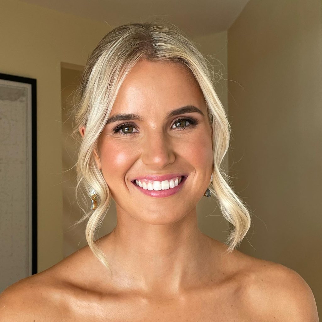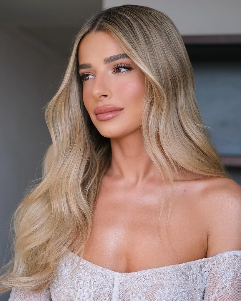 The core of this entire look revolves around achieving an effortless sun-kissed glow. The bride’s blonde hair is beautifully accented with warm-toned makeup elements such as bronzer and peachy blush. The green color of her eyes is enhanced by the use of earthly eyeshadows which create a natural effect on her. The final touch is the nude lipstick that makes the whole look coherent and radiant. This is a perfect choice for green-eyed brides who are after the glowing and natural effect.