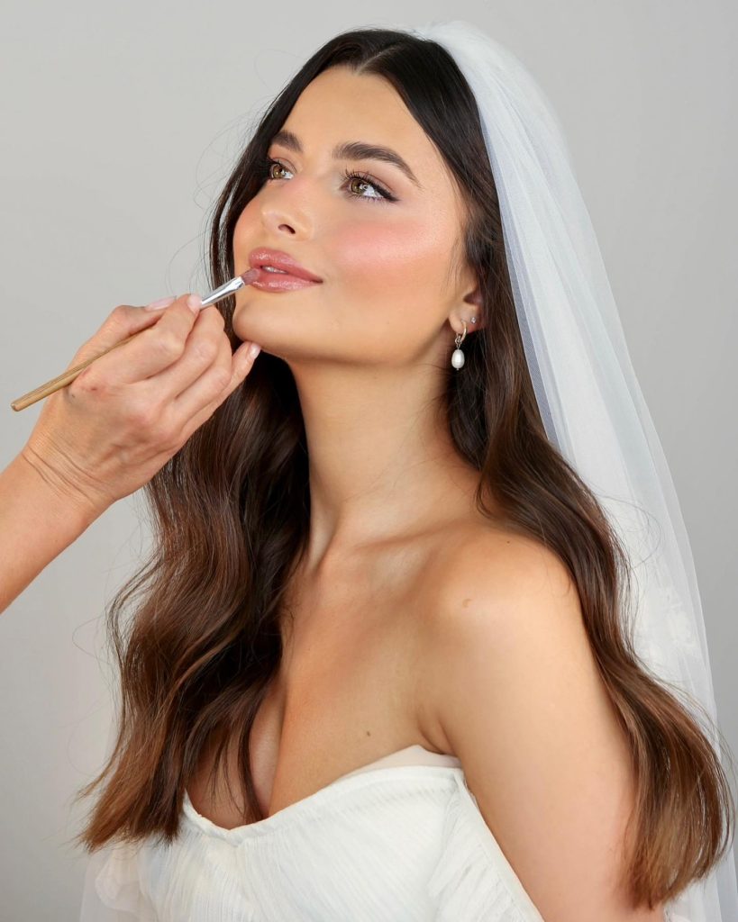 A brown-eyed wedding is the perfect backdrop for this unique bridal look. The artist of makeup has successfully laid down a glowing look with shine-breaking shadows and peachy colors that are a normal way to adjust the face. The lashes are long, but they are still simple enough to keep a timeless bride style. This soft brown-eyed makeup look, along with the matte finish and the little touch of blush, is very easily modified for a bride with light skin. The full, shiny lip is just the thing that the girdle needs to be contemporary glam, and this detail introduces a new, fresh, and natural side of the overall look.
