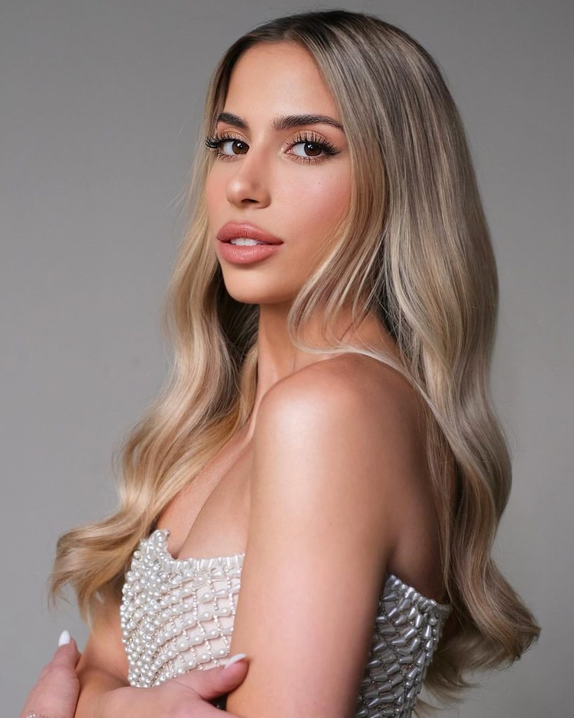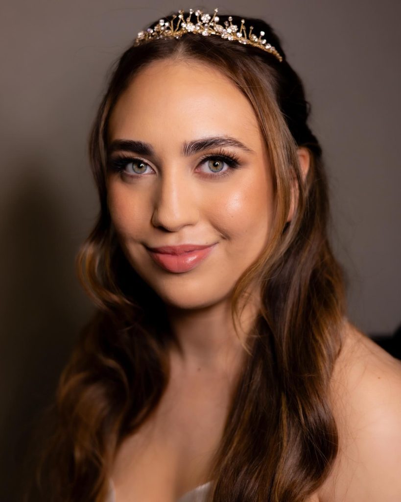This bridal makeup, which is romantic, and timeless, was made especially for blondes with a soft, warm palette that emphasizes natural beauty. This look flatters the bride’s glowing complexion with light eye makeup, subtle contouring, and a soft lip color. The golden crown with it blends with her blonde waves, thereby giving a fun and yet, a regal feel to the overall costume. For brides who want a purely classic and nature style, this can be used on bohemian or vintage-themed weddings, thus, the bride looks chic with no effort at all.