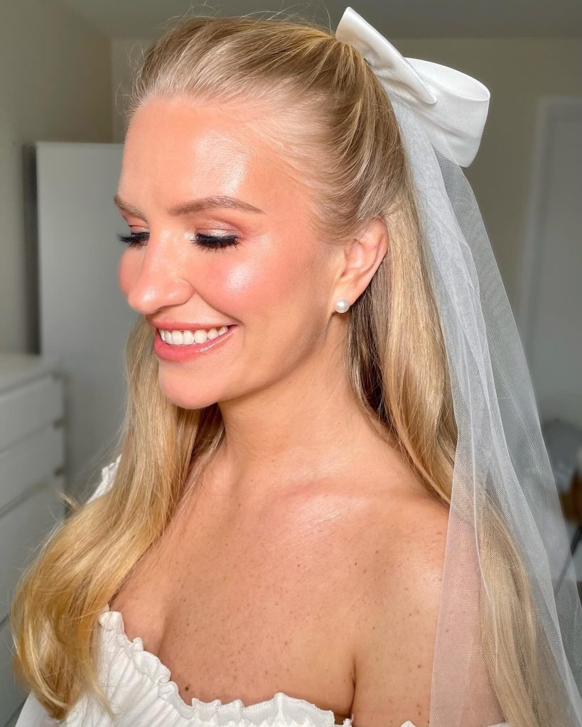 Natural luminance and a refreshing look are the primary characteristics of this style. The bride’s blue eyes are only slightly emphasized with just a bit of light brown eyeshadow and a hint of mascara, which makes them look absolutely gorgeous. A hint of soft pink is the shade for her lips, while her cheeks have only a natural flush to highlight her overall beauty. This kind of makeup is ideal for brides who wish to appear fresh and luminous.