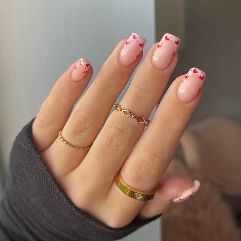 In this design, we have a delightful variant of the French tip, where the light pink base is decorated with red hearts and polka dots along the tips. This design is entertaining, attractive and an ideal choice for anyone who wants to decorate their nails with a fun yet chic element. The tiny hearts and dots are a creative manifestation of art in the field of nail design, which is preferred by both for casual and special occasions.