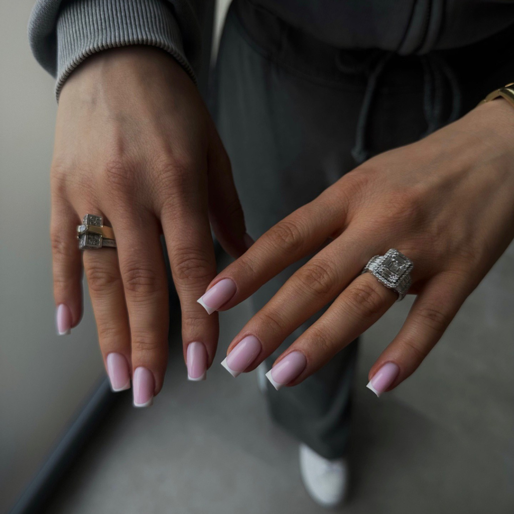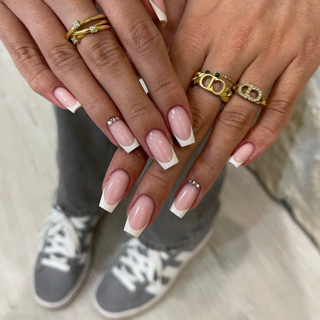 This design is a luxurious variant of the classic French manicure. It features long almond nails painted in soft pink and complemented by white tips. The distinguishing feature of this look is the tiny gems located at the base of each nail, which add a bit of shine and sophistication. This manicure is ideal for those unique moments when you want to be polished and different, it unites the classic style with a touch of modern glamour.