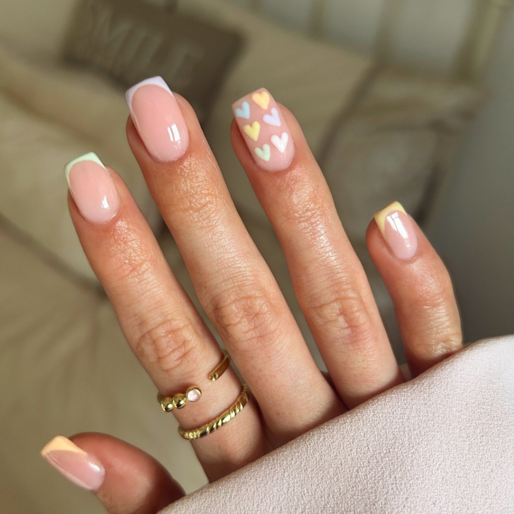 This is a fun and stylish nail that is a pinkish hue that carries soft colors of heart pastels on its tips (the heart shapes could be top or bottom placements.). The audience will delight in the bright and cheerful pastel undertones of the each and every nail. Girls who like to flirt with their style will particularly find this look appealing. It can be worn on various occasions like casual and festive events.