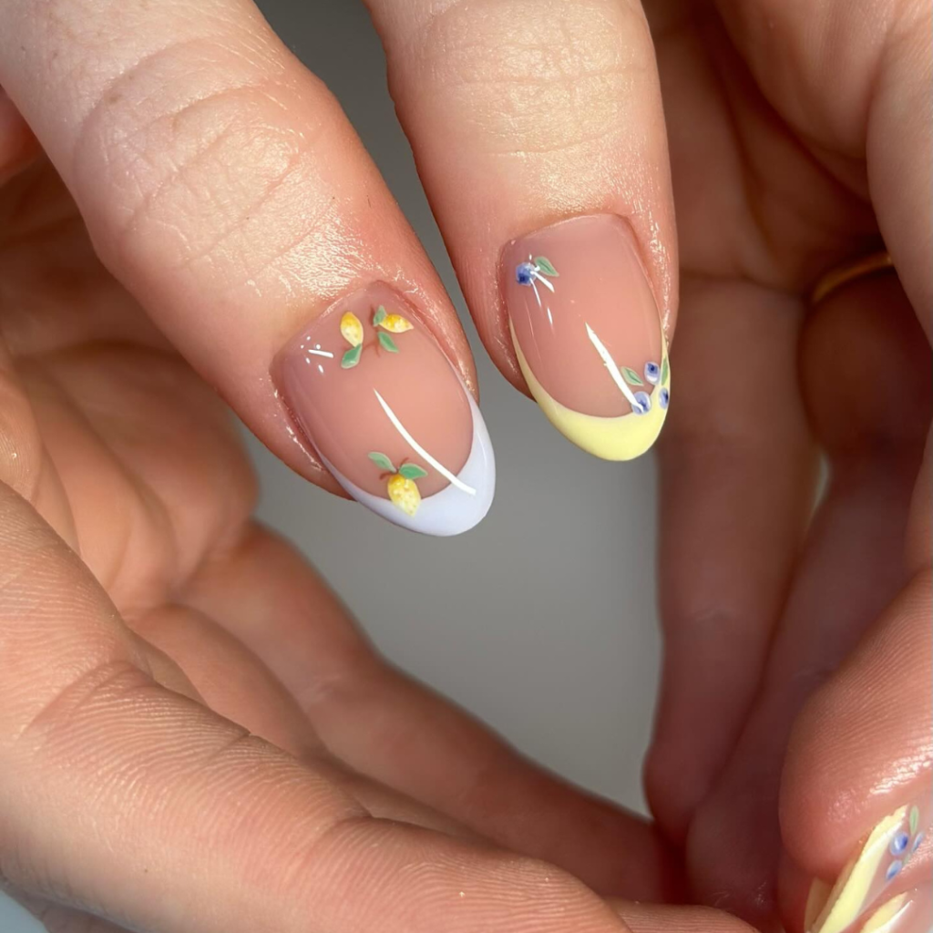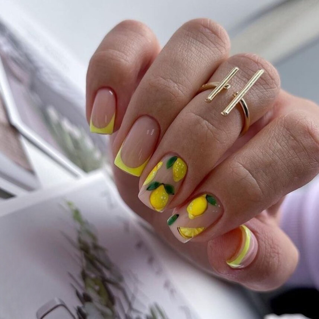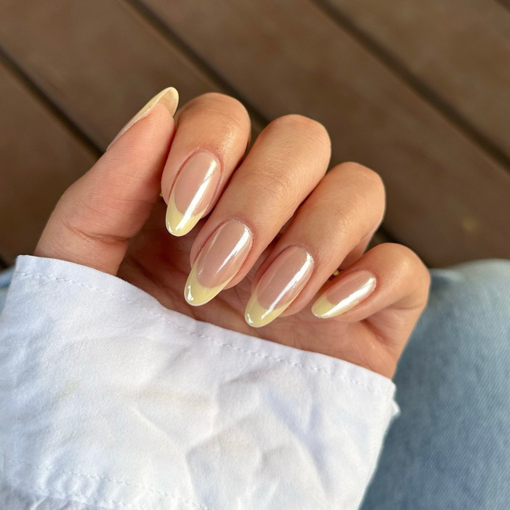 Over a pale yellow tip, delicate floral designs are brush-painted, bringing a playful and cute touch to the French manicure. This style is totally for the spring and is for the ladies who love to put some fun and art into their nail style. It is a distinctive choice for the festive seasons or just a way to brighten your everyday.