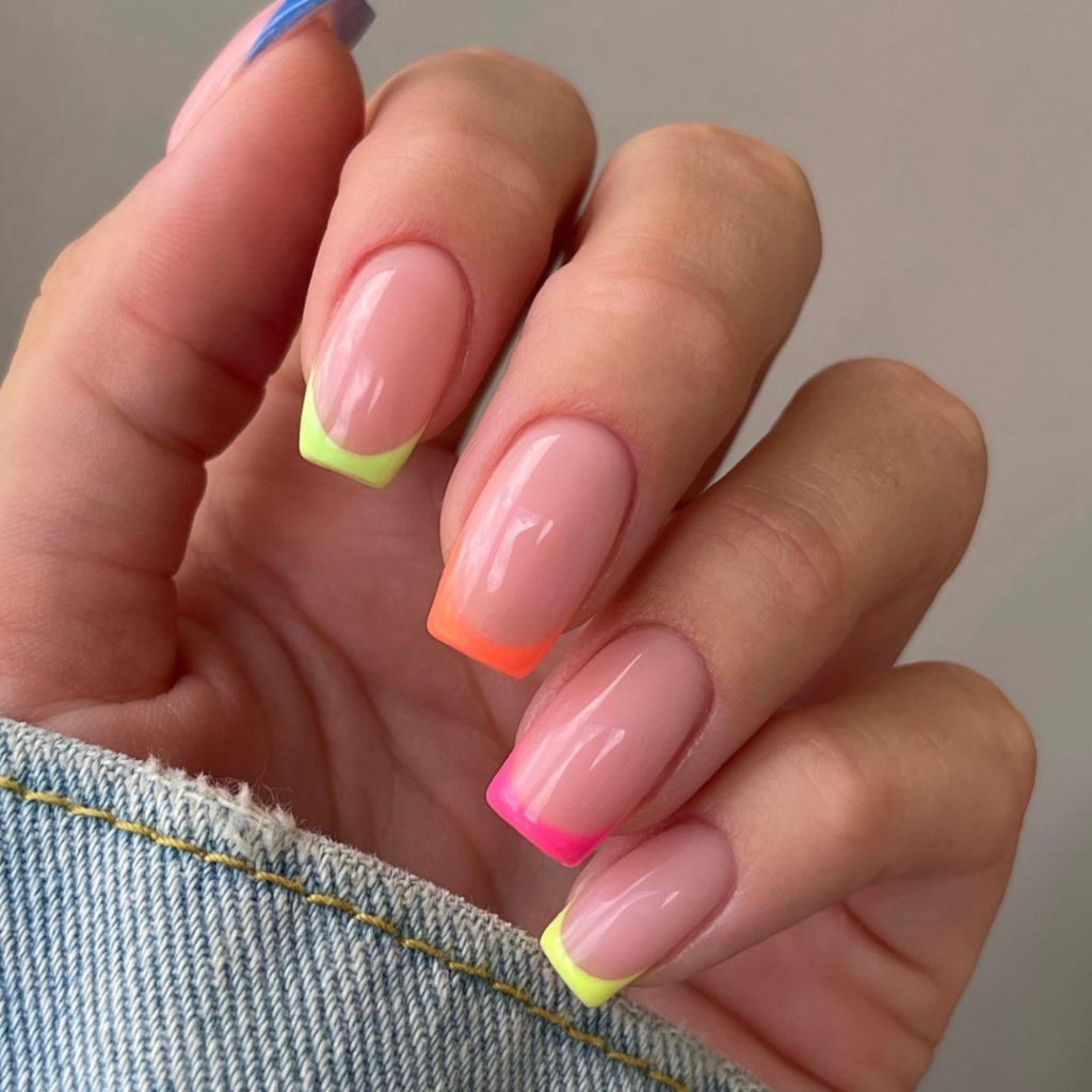 Against a natural nail base, these nails with bright, neon tips are a striking contrast. The vivid colors that come with UV lights from Superpink to Electric yellow balanced it. This perfect manicure is for people who are trendy, like to catch eyes of others, and wear a little kick with their daily outfits.
