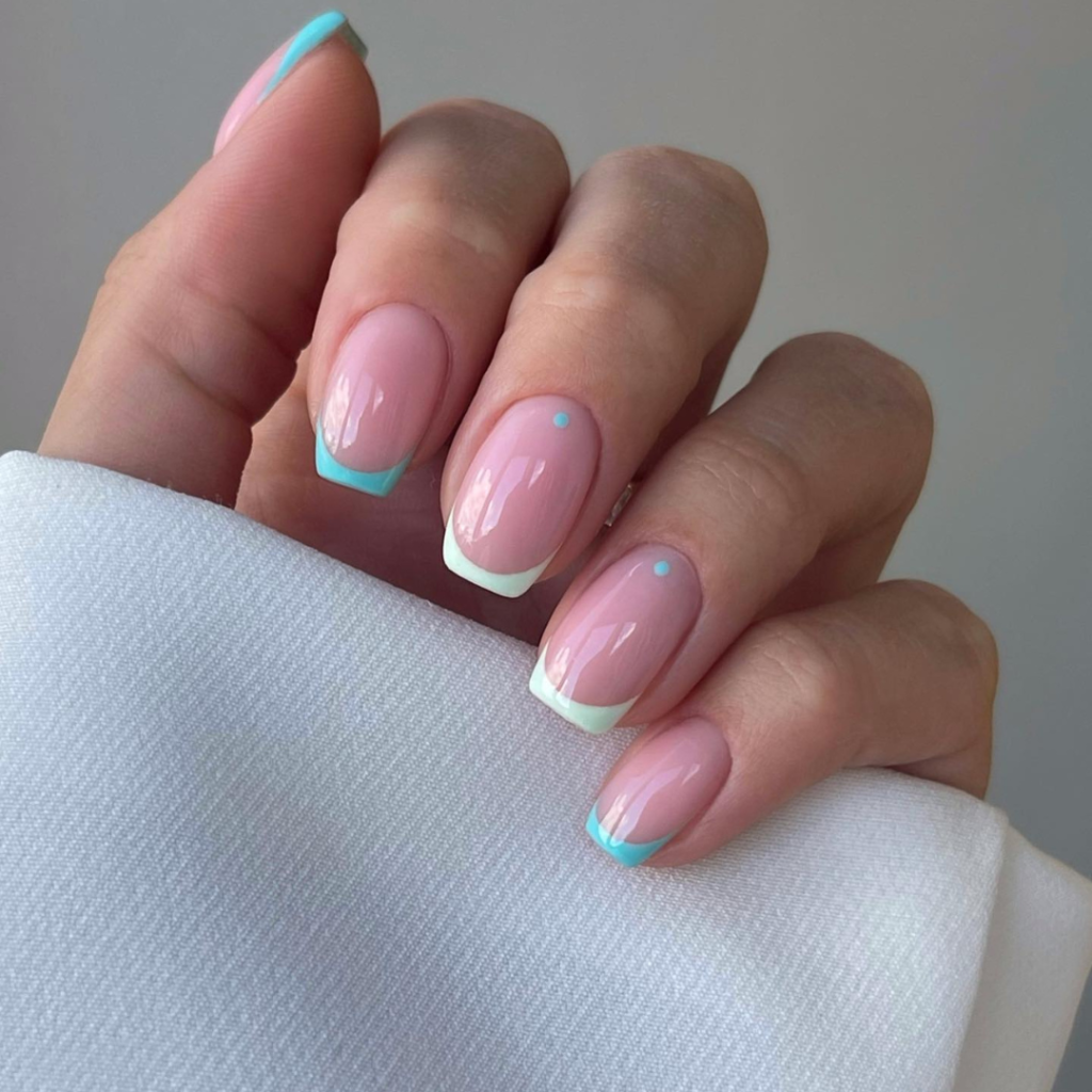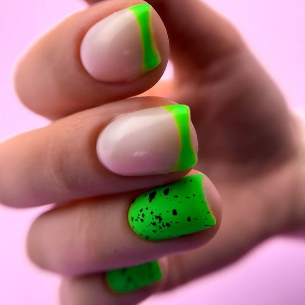 The one with this design is absolutely awesome for the confident and artistic. The neon green tip with a black splatter effect is the design of this short nail which makes a beautiful and remarkable soft white-colored base. It is a fashion statement that represents the spirit of rebellion and imaginative thinking of youth, and it is perfect for music fests or any occasion where you wish to be a trendsetter.