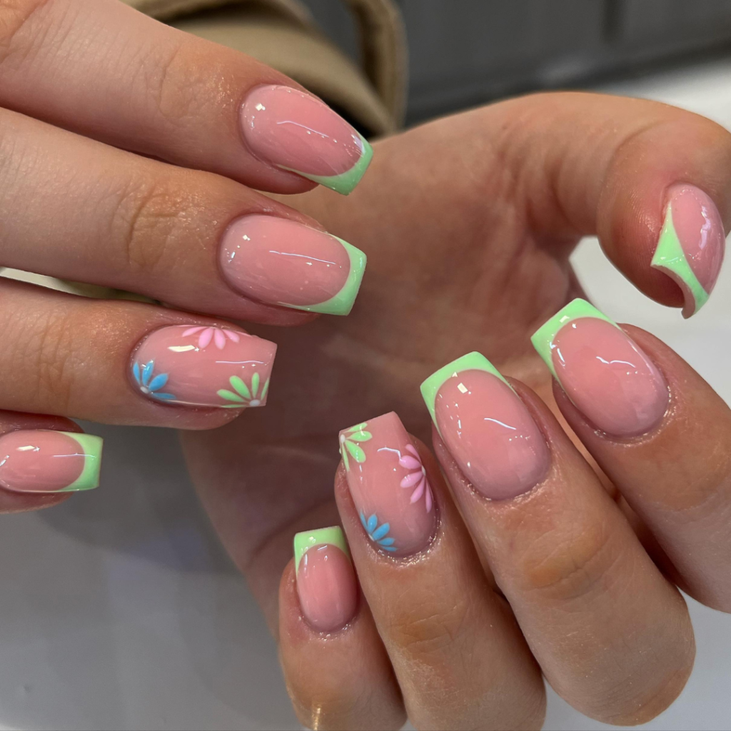 A French tip enhanced this way adds a spring mood to the style, as it uses a green edge tip, which is decorated with soft flowers on a pink base. It’s an ideal method to showcase nature-inspired art on your nails, suitable for the seasonal events or just for the joy of spring and summer.