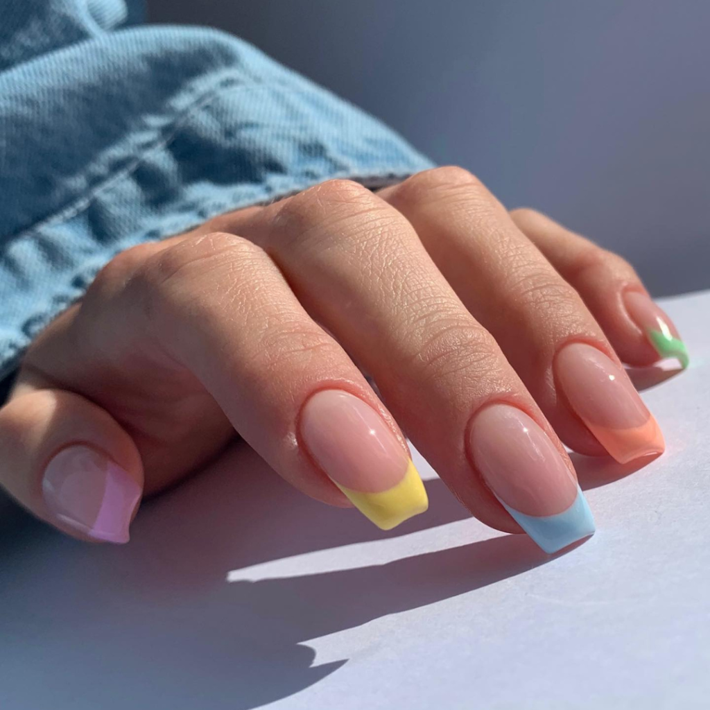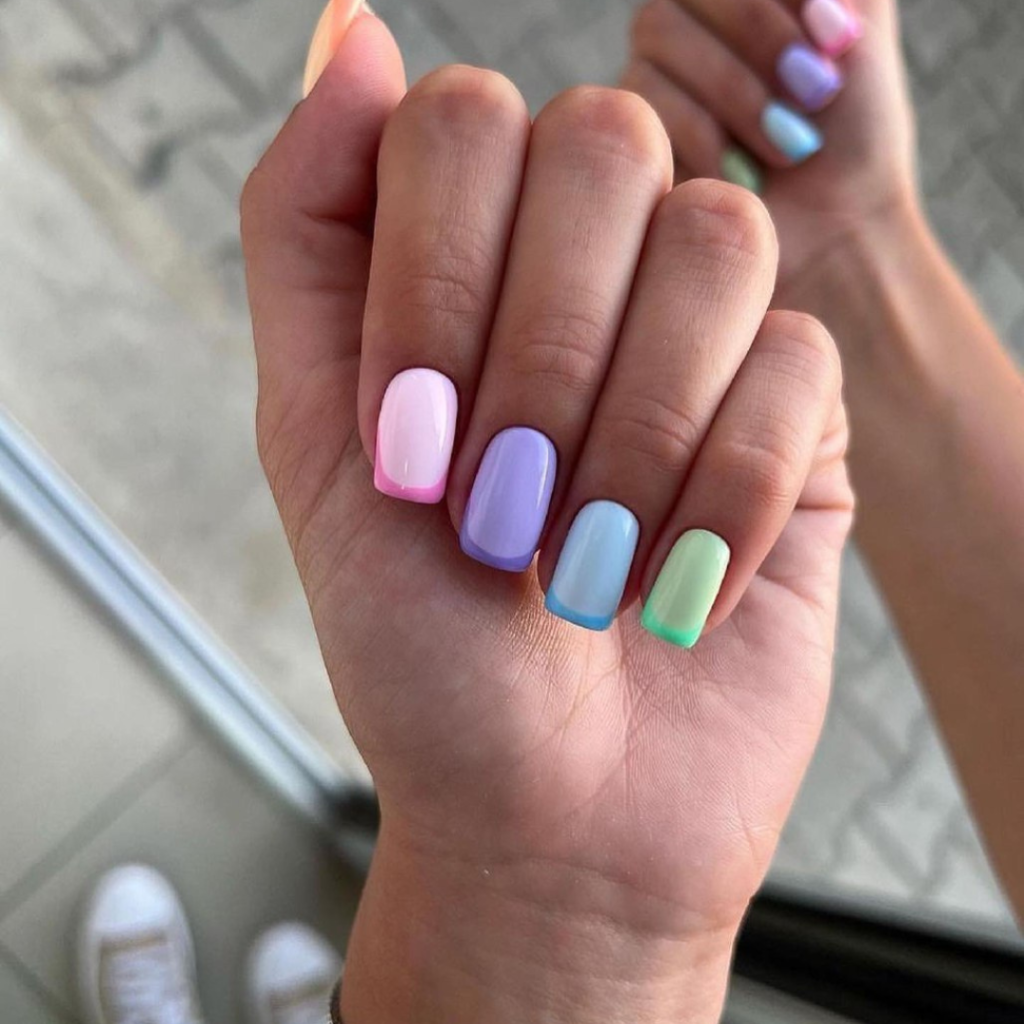 The cute and bright manicure shows a pastel rainbow tips, where every nail is done with a different soft color against a neutral base. Rather, it is a joyful, simple design with the added benefit that it gives a pop of color and a special style to any outfit, ideal for spring or summer, or, indeed, if you want a little sunlight wherever you go.