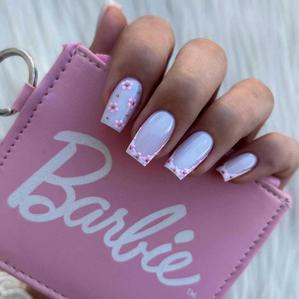 With the looking of these nails we can also assert that they are among the trendiest nail designs this summer. Almond-shaped long nails, sheer pink base with bright white tips that resemble a slim arc along the nail shape, White tips, gently curved White curved tips, gently Natural almond nails with semi-transparent pink base and white curved tips. Each nail is decorated with pin-sized miniature flower patterns that are darling and hold just the right amount of spring and summer festivity. This design is in chic contrast to the typical beauty of the French tips by the use of the fun art, which makes it the right choice for those who desire to add a botanical touch to their style.