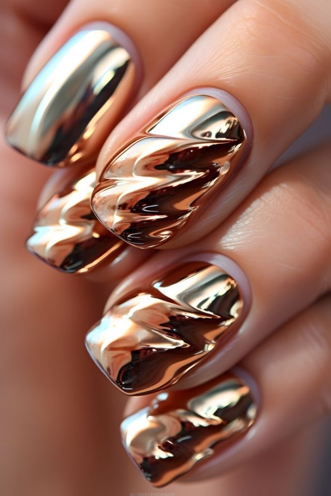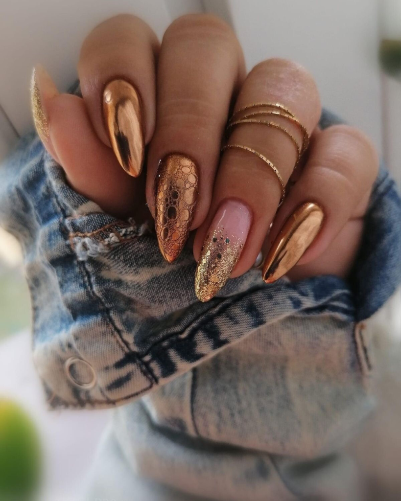 The beautiful bronze chrome nails add elegance and sophistication to oneself. Good-fitting soft metallic with almond shape introduces a fashion style on a daily basis which is glamorous and trendy. While being simple, the design is also very noticeable with a little shine. The warm bronze color is the perfect match for any skin type and it is great to wear with the chilly fall collection or going-out outfits.