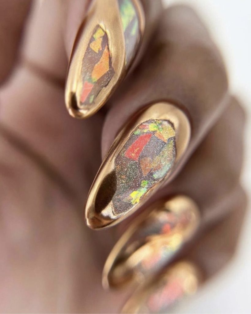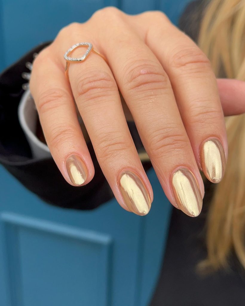 Square-cut gold chrome nails are a great fit for the woman who has the power to fill any space with her presence and who radiates confidence. These nails are all about the business with a little bit of design. The square-shaped finish has a shiny surface like a mirror that attracts glances, thus combining style and luxury. Pair these nails with a white shirt and dark denim for a trendy business casual look that goes seamlessly from a meeting to a cool dinner outside.