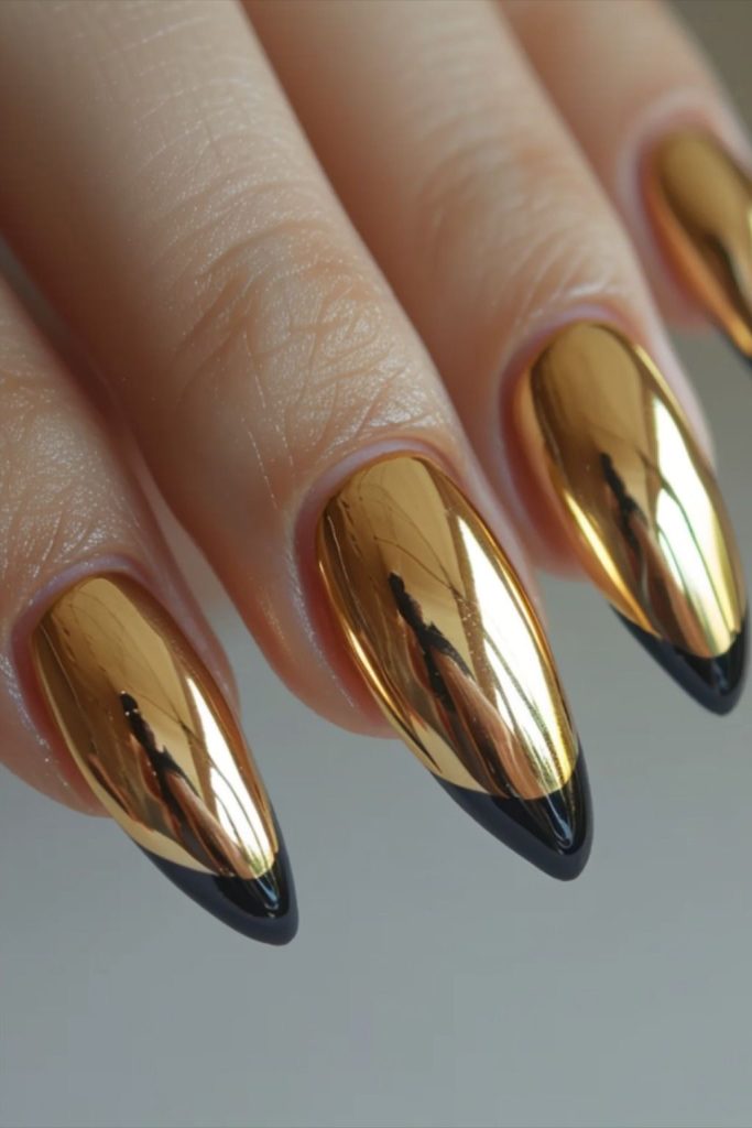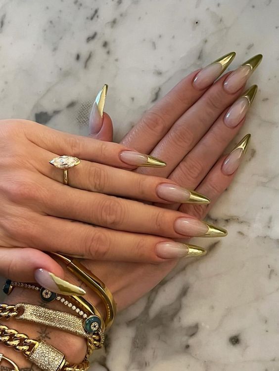 These nails are indeed the beauty wizardry as they are able to change the whole nail into a reflective surface of pure gold. The almond shape of this design is an ideal choice for people who are not afraid to go bold, and therefore the nails itself become an accessory. You can wear them with solid color outfits or dark leather to let the nails be the center of attention in your fashion.