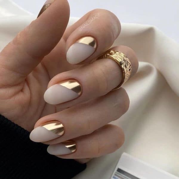 Nails with a lush foundation of the color cream that are decorated with gold chrome only a gentle stroke of makes the best value for neutral lacquer. The nails are the picture of the idea, showing that brightness does not have to be boring. A perfect example of code, this model of nails is for those who like to wear the short ones but really want to be different and creative. You wash your favorite denim jeans and these nails are always looking and feeling chic, casual but not overdressed.