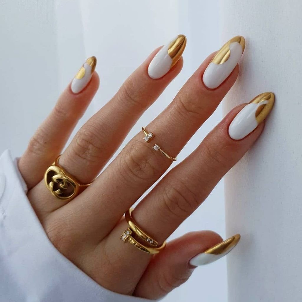 Inspired by the old-fashioned beauty, the half-moon nail design has now been with a gold chrome finish. The gold crescent at the bottom of the nail contrasts with the white canvas clearly showing the combination of vintage and contemporary styles and hence, the design has a retro look that is simultaneously futuristic. Wearing these nails will be perfect with a dress adorned with pearl details or a classic trench coat, therefore, turning into similarities with the past yet standing firmly with one’s side in the present.