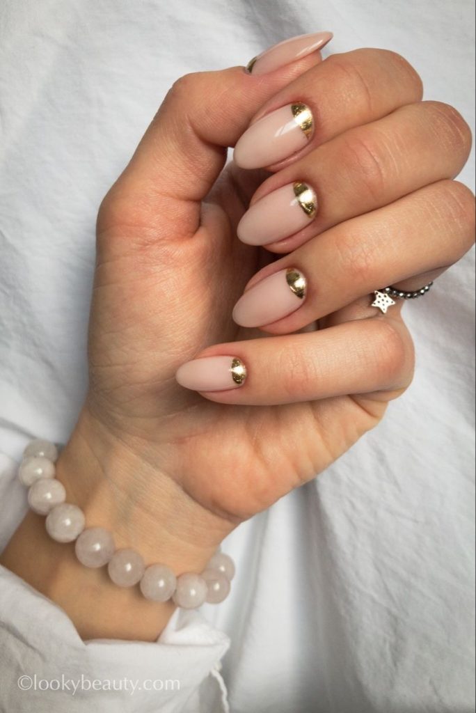 This set of nails features a truly original twist on French designs. They are made of a nude matte polish complemented by a shiny gold tip, which is the only shiny element of these nails. The overall effect is a design square with a very modern and elegant look. These nails are for those minimalists who really enjoy the small details because of it they show that the saying ”less is more” is perfectly true. Adding them to an outfit of a satin blouse and a pair of tailored trousers is a definite person who speaks a lot through only the subtle.