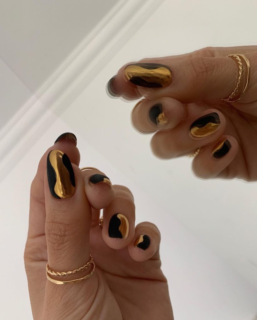 The design merges the industrial shades of grey with the warm gold luster, which creates a nail art that is both elegant and simple. Gold chrome nails with a silky luster are the only things that cut through the soft-toned background, just as the subdued luxury of a cloudy day brightly illuminated by a ray of sun is. This trend is for someone who appreciates the differences of the modern and the traditional thus it is a great choice for both business and friendly meetings.