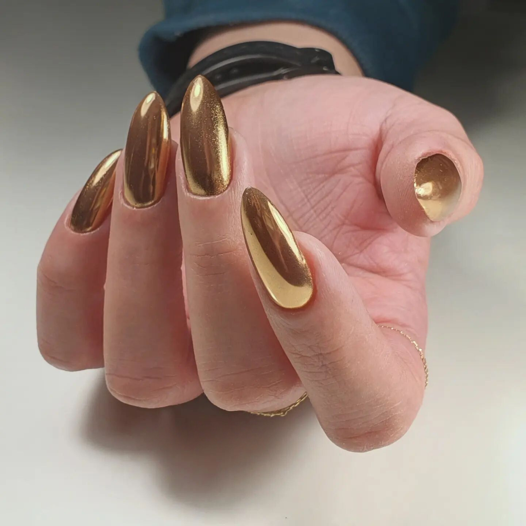 Almond nails are the most beautiful and classy, and the inclusion of gold chrome on them makes them a sign of sophistication. This design is a modern, streamlined approach to the traditional almond style, and it is ideal for people who love combining the classic and the current. The shiny finish reflects light and draws attention to itself. It is a universal option that goes with both daytime and evening appeals. For a power outfit that simply communicates your great taste, combine nails with a structured blazer and tailored trousers.