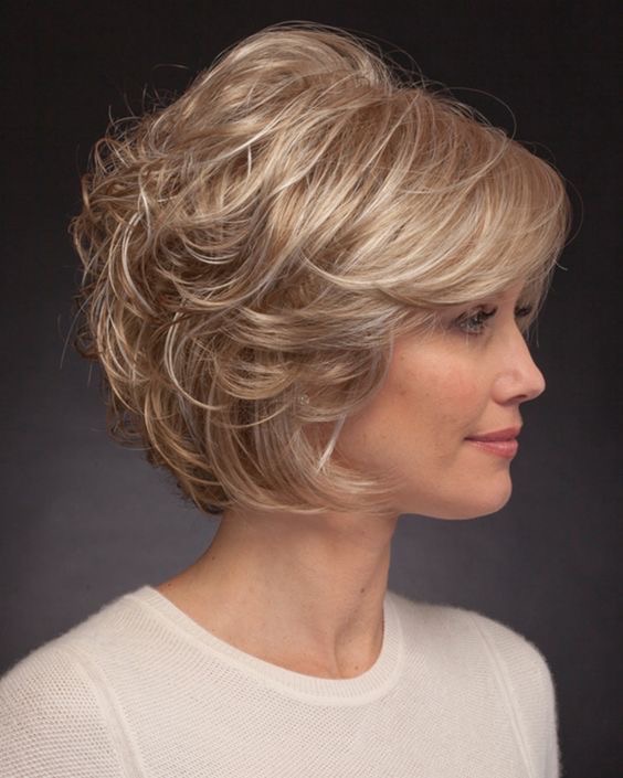 What we have in front of us is a honey-blonde wavy bob that looks extremely radiant with golden reflections. The shiny shade that reflects light together with the slight curls builds a style for a cheerful and friendly person. This is a wonderful option for women in their 50s who want to show off their natural hair type in a fresh way, and at the same time have fun with a warm splash of color.